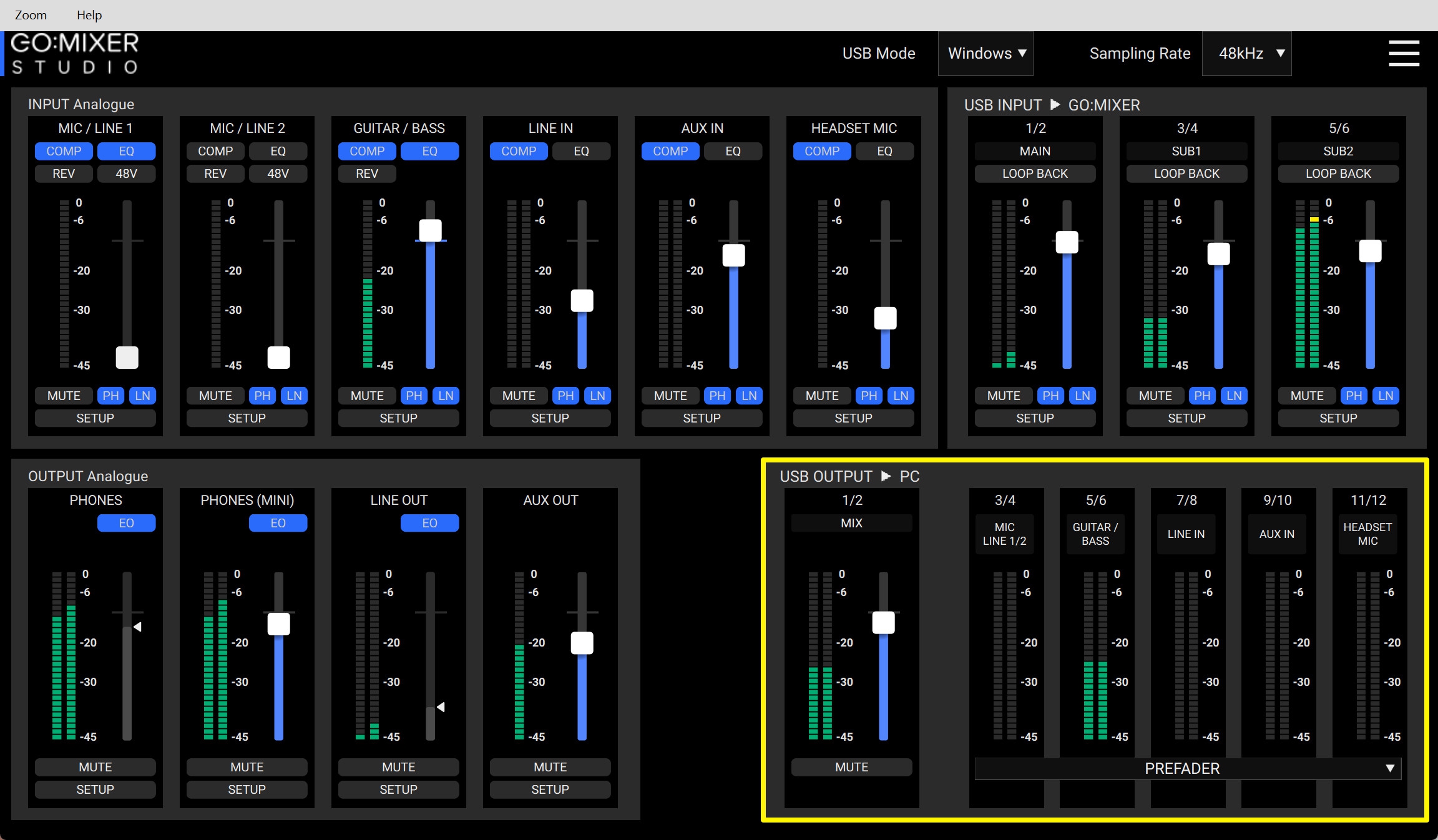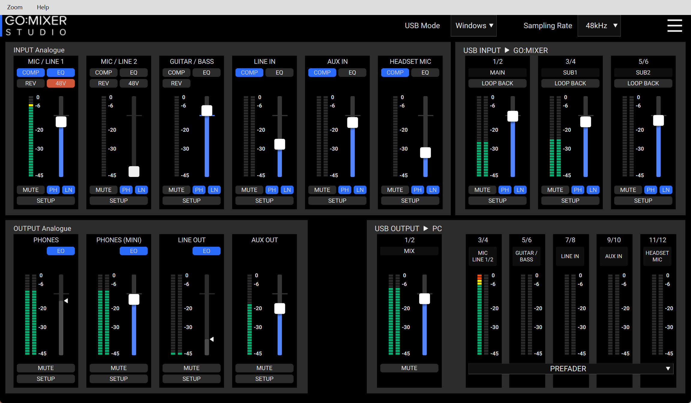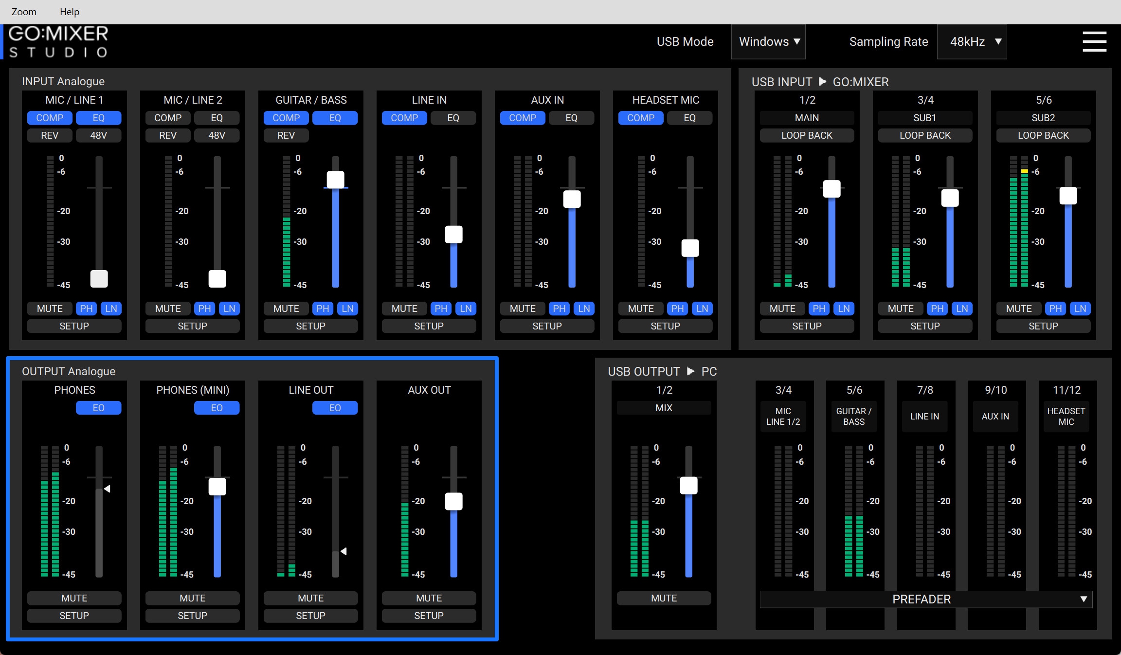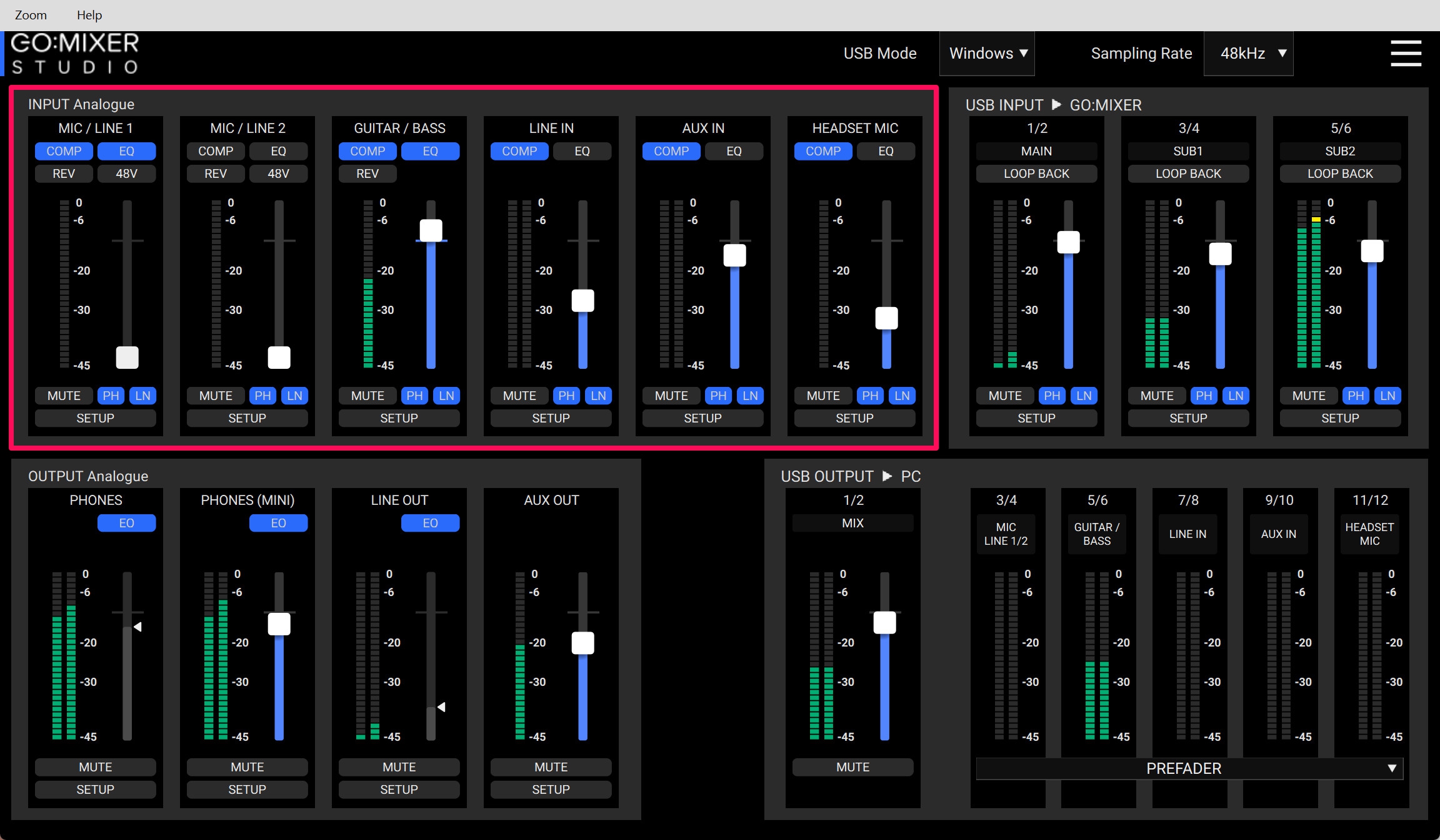 左側のINPUT Analogueセクションには、物理的な入力端子に対応するチャンネルが表示されます。MIC / LINE 1、MIC / LINE 2、GUITAR / BASS、LINE IN、AUX IN、HEADSET MICのそれぞれが並んでおり、各チャンネルには、COMP(コンプレッサー)、EQ、48V(ファンタム電源)のボタンがあります。これらをクリックするだけでオン/オフを切り替えられます。また、フェーダーでレベルを調整し、MUTEボタンでミュートのオン/オフが可能です。SETUPボタンを押せば、そのチャンネルの詳細設定画面が開きます。