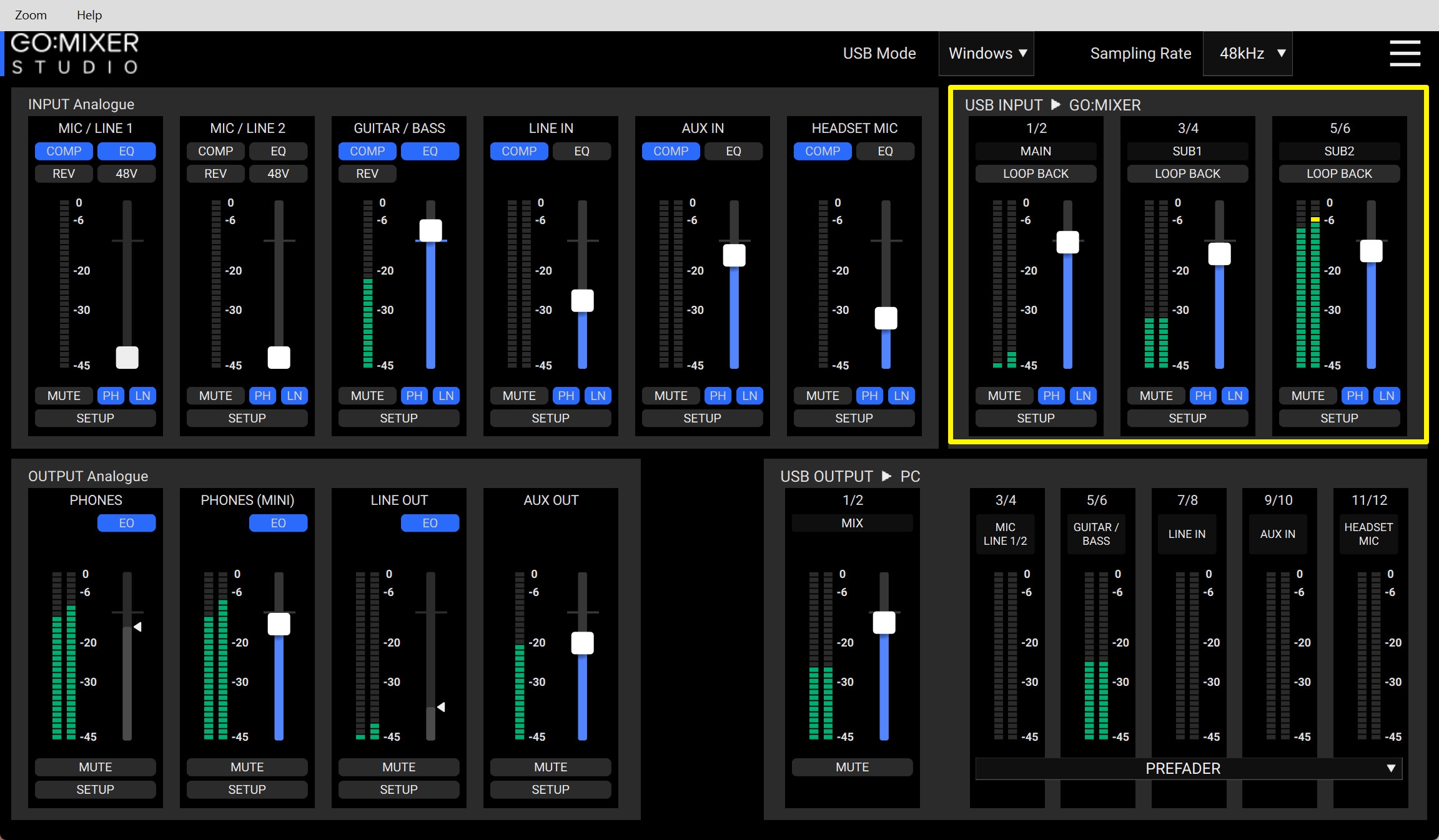 右側のUSB INPUTセクションには、PCからGO:MIXER STUDIOへの入力チャンネルが表示されます。こちらは1/2:MAIN、3/4:SUB1、5/6:SUB2のそれぞれがあり、各チャンネルにLOOP BACK(ループバック)ボタンがあり、これをオンにすると、PCから各USBチャンネルに再生した音声を、PCのMIXチャンネルに戻すことができます。