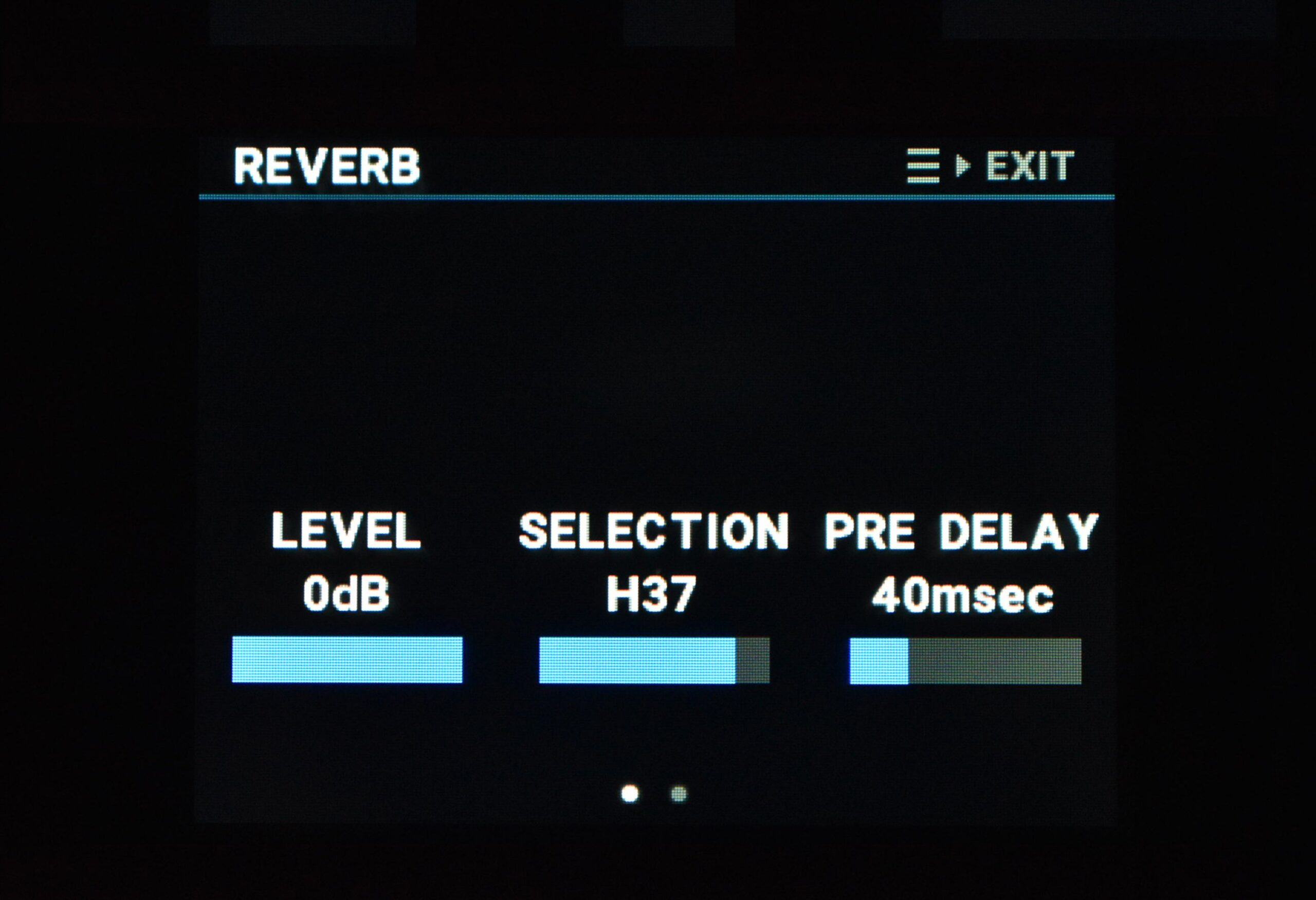 リバーブの設定は、メニュー画面から行います。LEVEL(リバーブの音量)、SELECTION(リバーブタイプ)、PRE DELAY(原音からリバーブ音が鳴るまでの遅延時間、0~160msec)、TIME(余韻の長さ、0.1~99.0秒)、HF DAMP(高域成分の調整、0.05~1.00)といったパラメーターを調整できます。