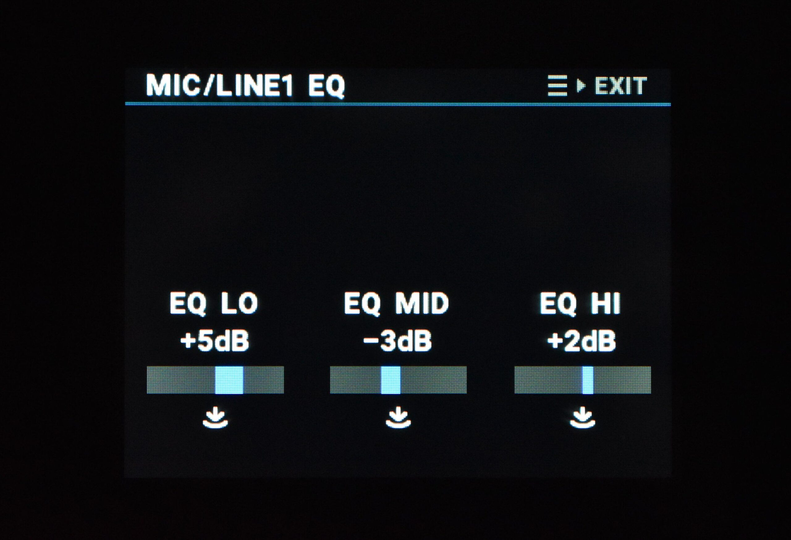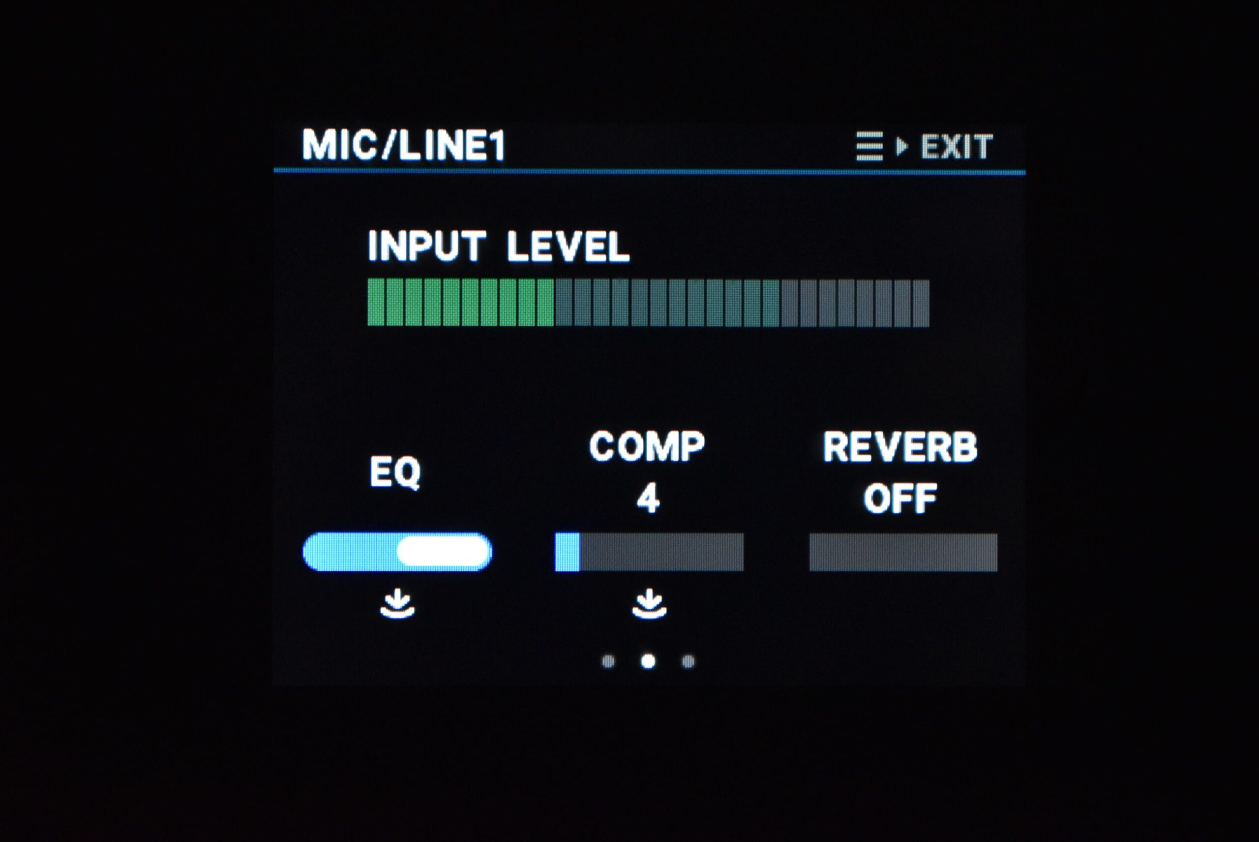 これにより、例えばボーカル録音時に低域のノイズをカットしたり、ギターの中域を強調したり、といった細かな音質調整が可能です。EQの設定は本体のディスプレイで視覚的に確認しながら調整できるので、直感的な操作が可能です。
