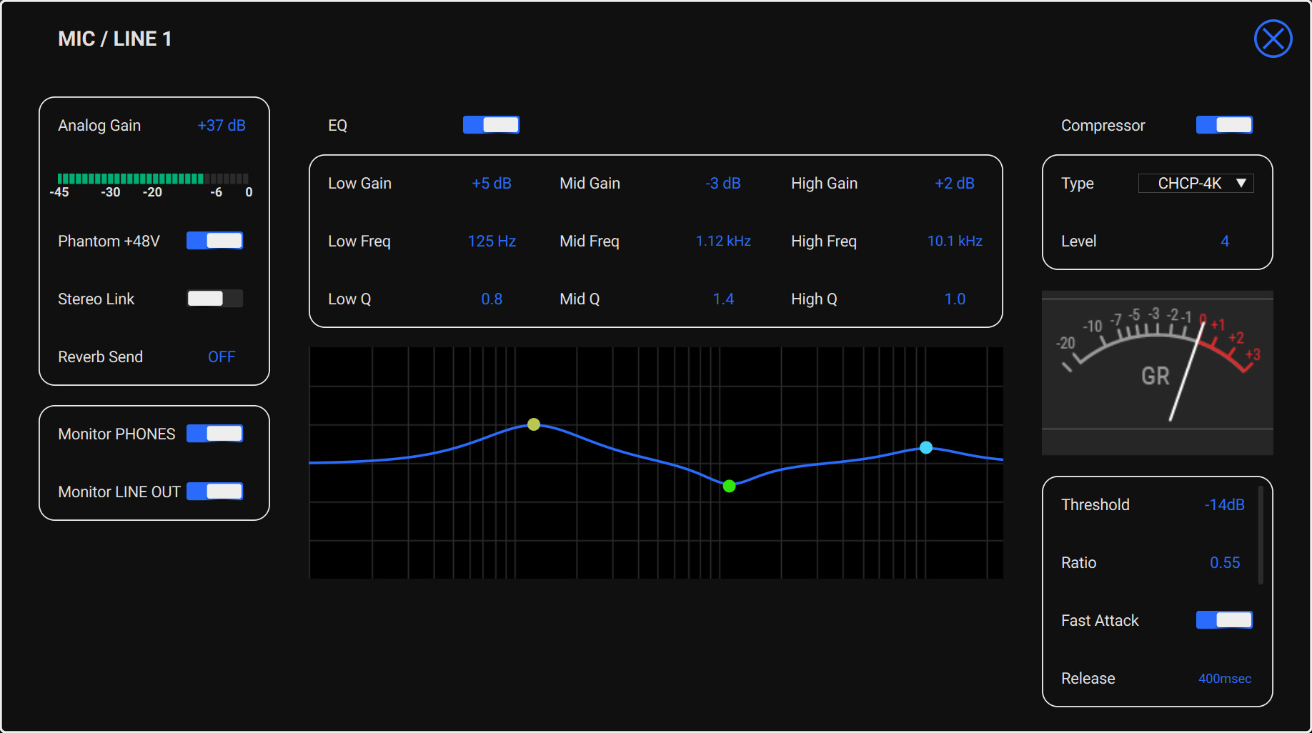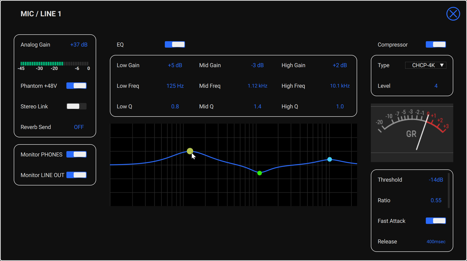 LOW、MID、HIGHの各バンドごとに、Gain(±12dB)、Freq(16.0Hz~24.0kHz)、Q(0.4~16.0)を調整でき、リアルタイムでグラフに反映されます。これにより、狙った音作りが簡単にできます。