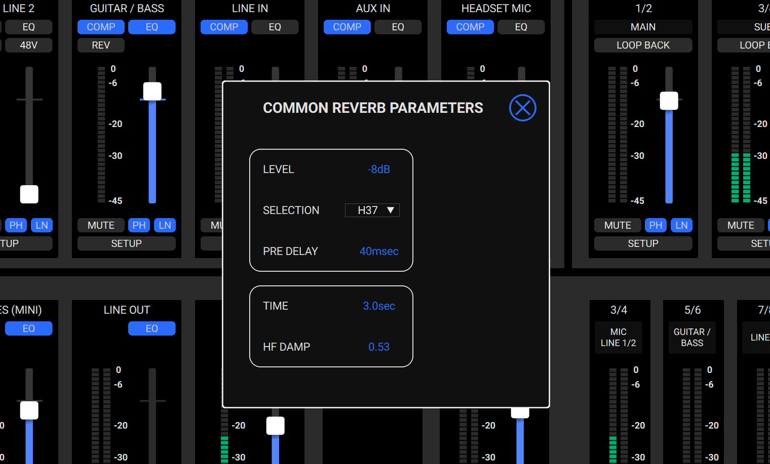 各チャンネルのSETUPボタンを押すと、詳細設定画面が開きます。ここでは、EQやコンプレッサーのパラメーターを細かく調整できます。
