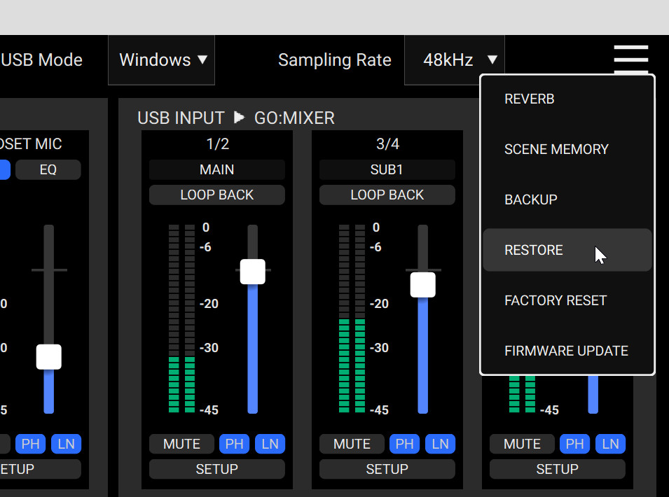 USB MODEの設定は、本体のメニュー画面から「USB」→「MODE」で変更できますが、GO:MIXER Editorからも設定できるようになっています。画面右上のドロップダウンメニューから「2 Ch」「Multi-Ch」「Windows」を選択できます。