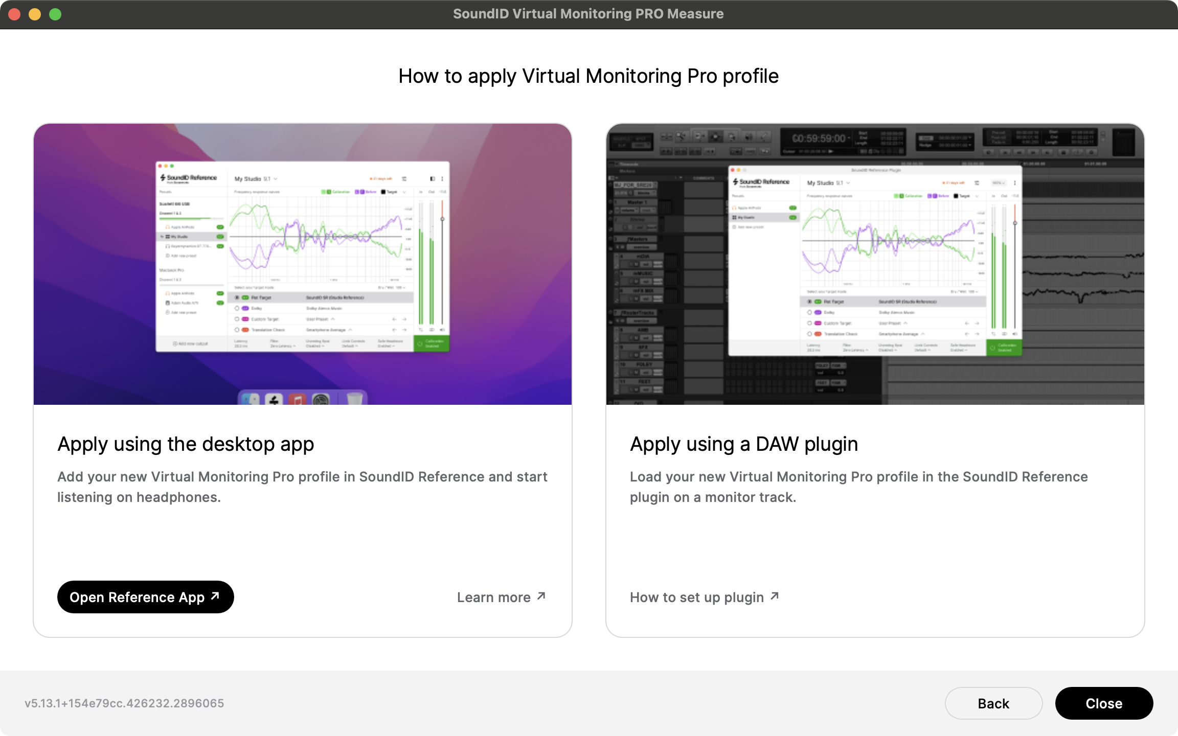 Virtual Monitoring PROで測定した結果が保存されたプロファイルをSoundID Referenceに読み込ませていくわけですが、これも今までと同様、画面の指示に従えば簡単でした。Virtual Monitoring PROでの測定後、デスクトップアプリに読み込むか、プラグインに読み込むか、表示されるので、お好きな方を選んでください。デスクトップアプリ上に読み込んでおけば、音楽制作時以外、たとえばYoutube、Netflix、AppleMusicで音を再生するときにでも、部屋を再現することができるので、私は「Apply using the desktop app」を選んで、設定しました。