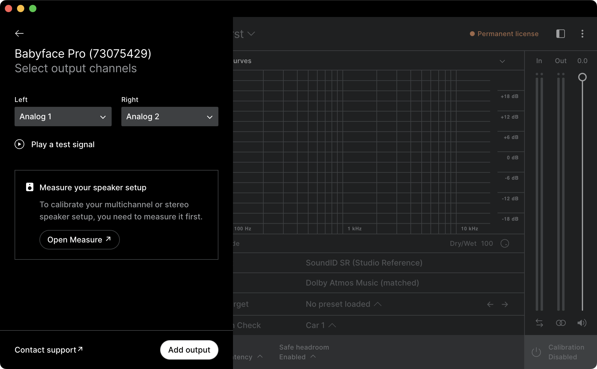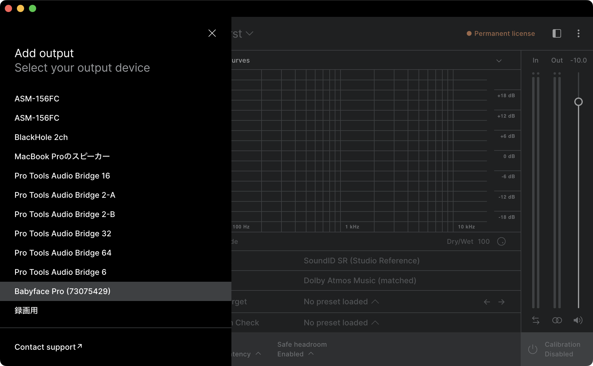 プロファイルを読み込んだら、全行程終了です。見事にヘッドホンに、自宅のスピーカー環境のサウンドが再現されるようになりました。ちなみに、SoundID Referenceの音を有効にしたいときには、スピーカーの出どころをオーディオインターフェイスでなく、「SoundID Reference」にしてくださいね。