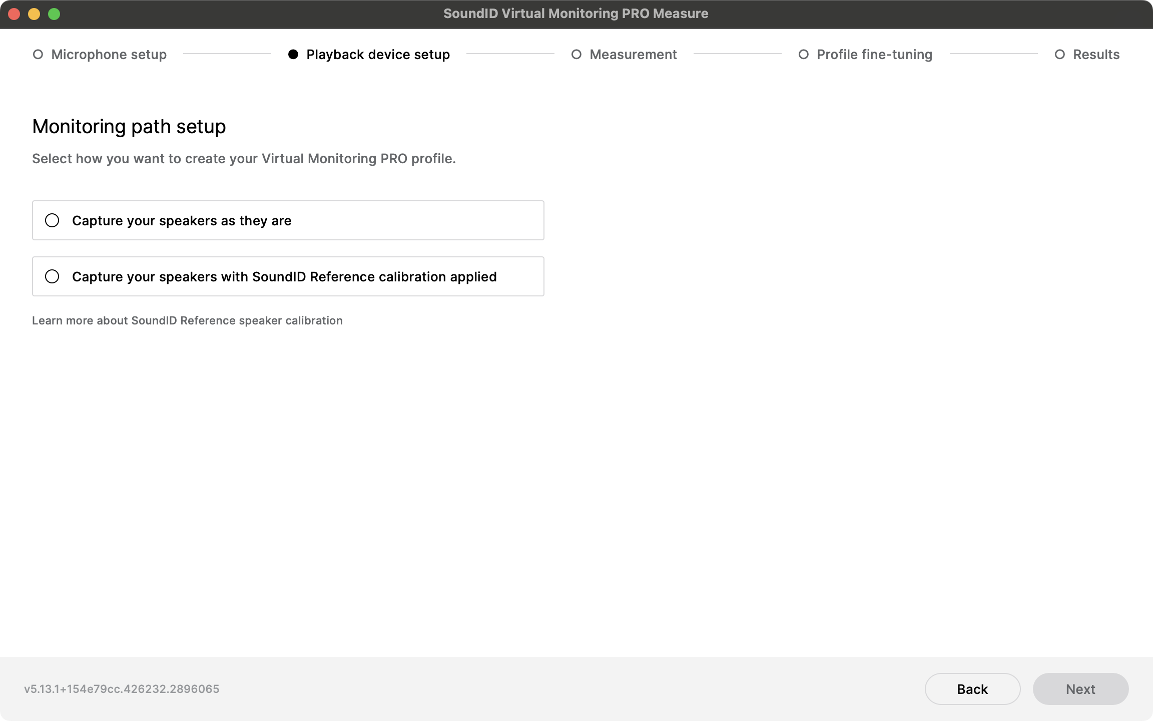 これがOKなら、次にVirtual Monitoring PROのプロファイルを作成するにあたり、そのままをキャプチャするか、SoundID Referenceでキャリブレーションした音をキャプチャするか聞かれます。今回私の環境は、NEUMANN KH 80 DSPとKH 750 DSPの組み合わせで、すでにNEUMANN側でキャリブレーションしているので、そのままをキャプチャする方法を選びました。