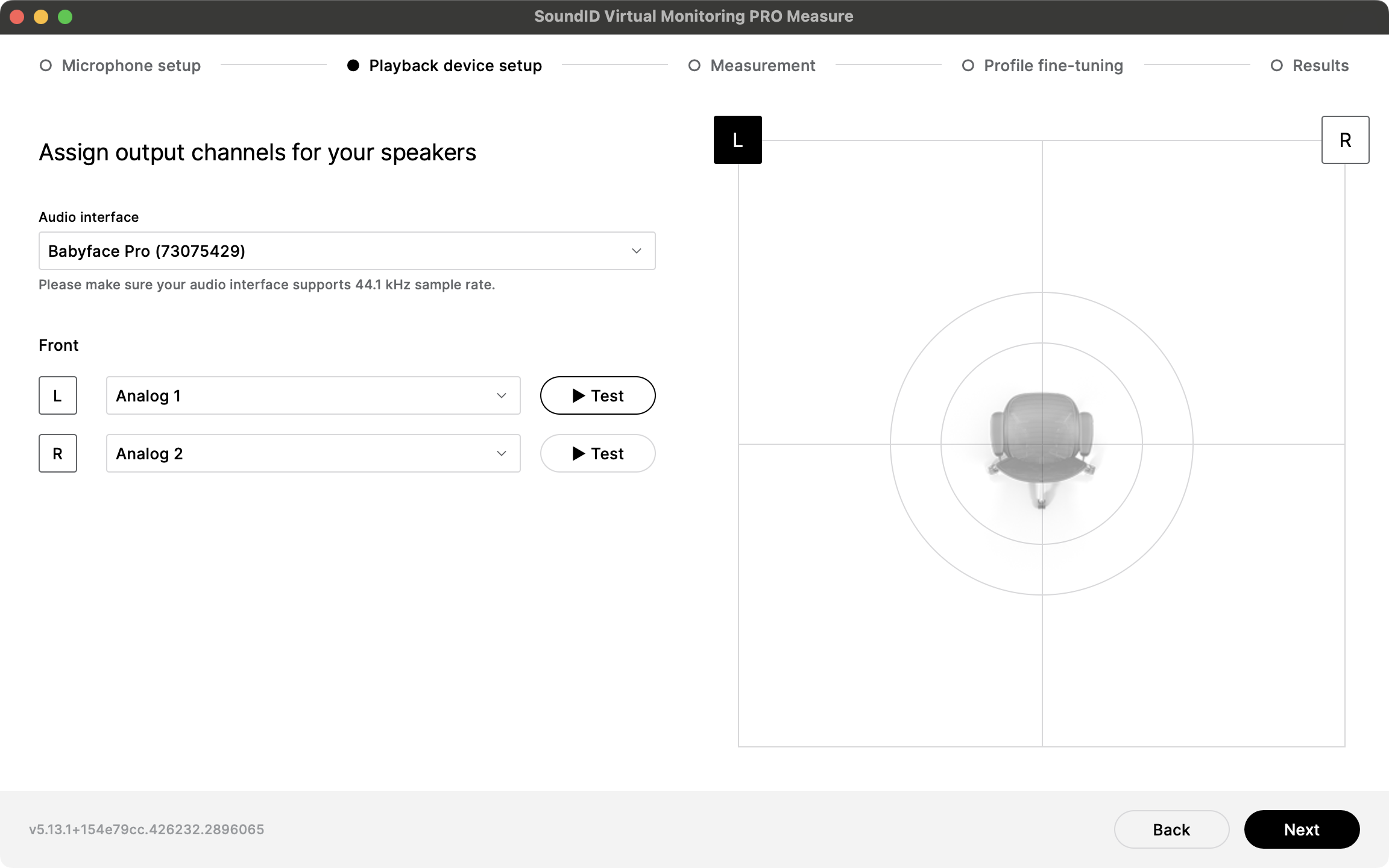 両耳ともOKだったら、続いてスピーカーのチェックに入ります。スピーカーを繋いでいるオーディオインターフェイスを選択して、L/Rのテストサウンドを再生し、きちんとスピーカーが繋がっているか確認します。