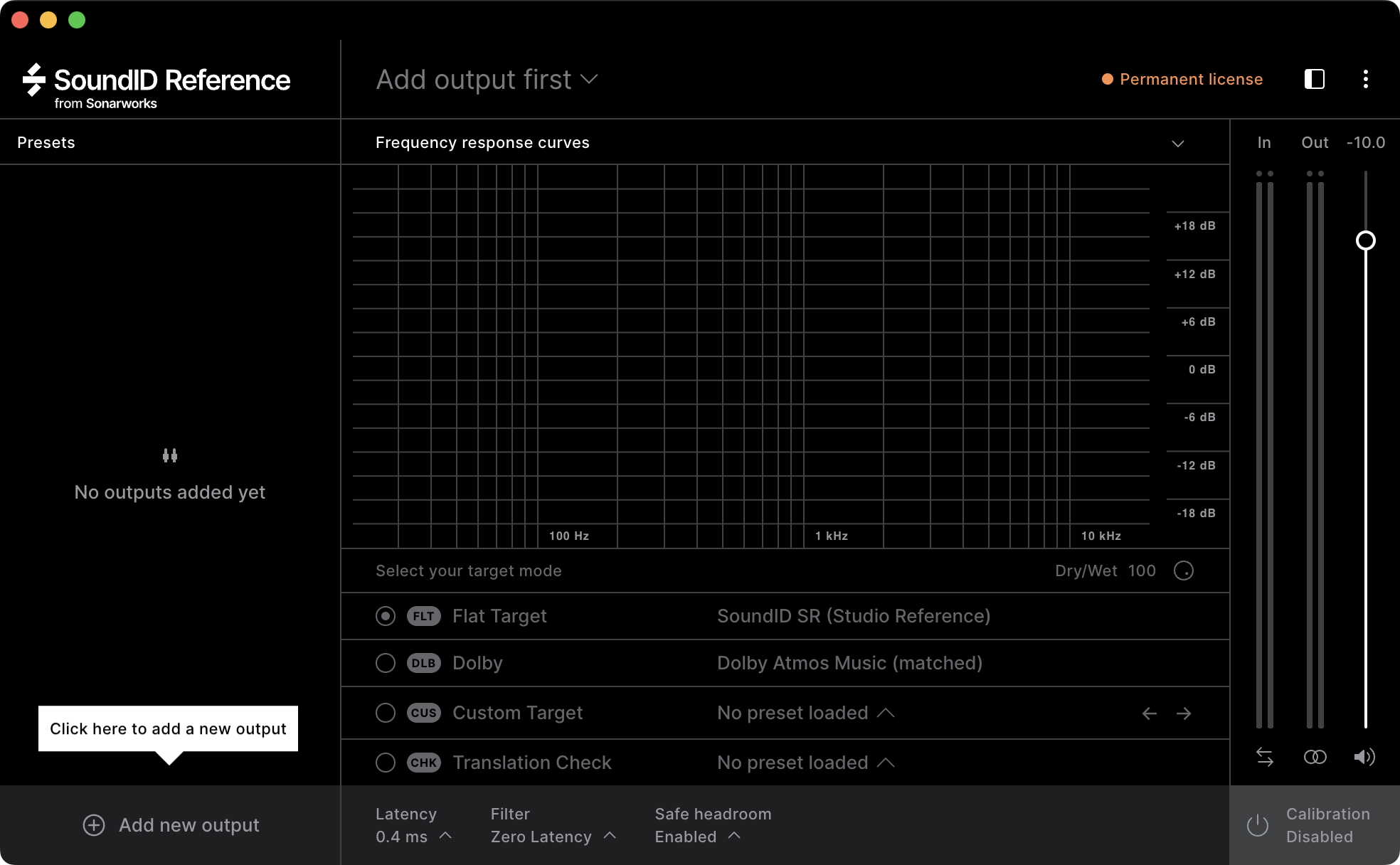 上記の画面で、「Open Reference App」をクリックするとSoundID Referenceが起動します。すると、「Click here to add a new output」という指示に従い、「Add new output」をクリックします。