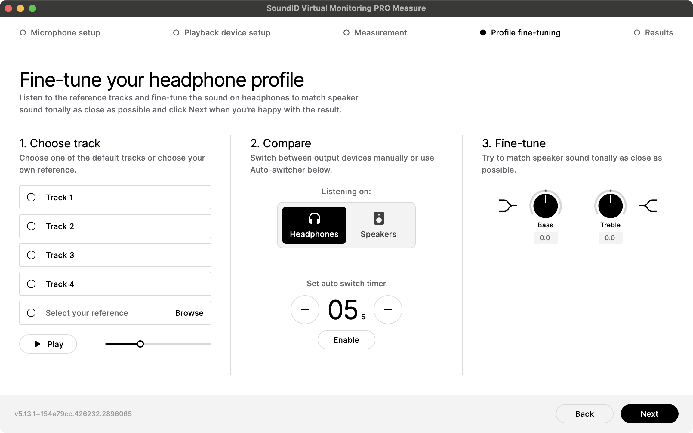 測定が完了したら、最終調整。用意されたリファレンストラックや自分のリファレンスを聴きながら、最後は自分の耳で低音と高音を調整していきます。比較方法も考えられており、ワンクリックで切り替えられるほか、秒数で自動で切り替えることができるので、ヘッドホンを着けたり外したりしながら、実際にスタジオで鳴っているスピーカーと照らし合わせて設定していきます。
