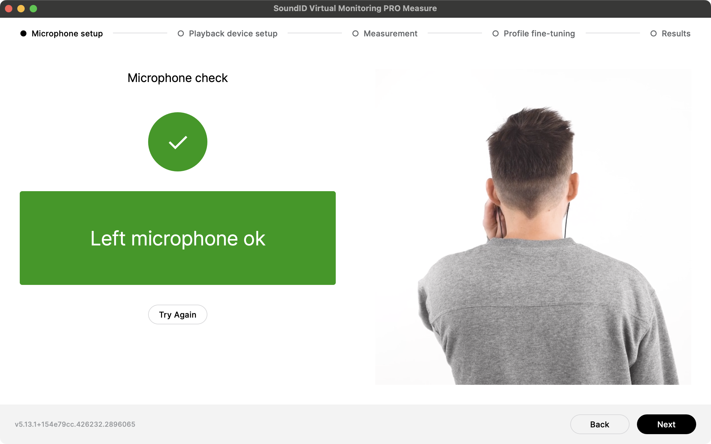 初めての場合、測定に掛かる時間は10分〜20分程度だと思います。日本語化されていないですが、ビジュアル的に分かりやすくセットアップ方法を教えてくれるので、特に迷うことなくセットアップを完了させることができました。まずは、起動して少し進むと、ちゃんとSonarworks EREF USB microphone、つまり黒い長方形の機材とイヤホン型のバイノーラルマイクが接続されているか?再生デバイスのサンプリングレートが44.1kHzに設定されているか?など、チェックリストが表示されます。1つずつ確認しながら、ボックスにチェックマークを入れていき、すべてチェックを入れると次に進みます。