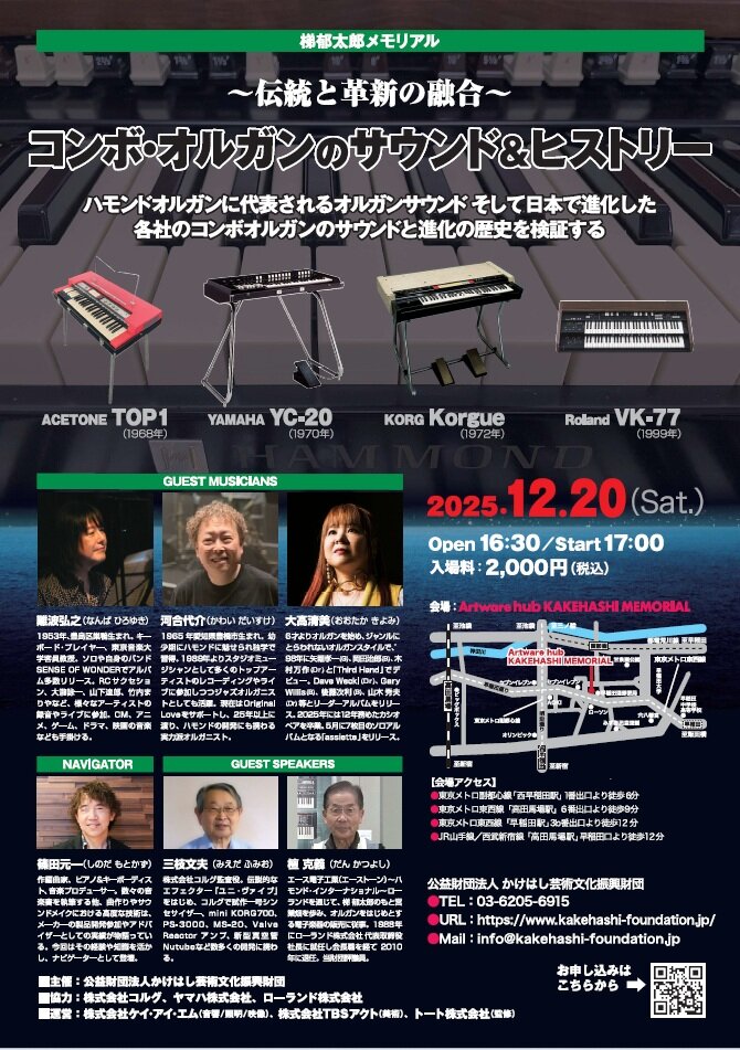 公益財団法人かけはし芸術文化振興財団では、今回の「ステージピアノが生んだ音楽文化」に続き、次回はコンボ・オルガンをテーマとしたイベント「~伝統と革新の融合~コンボ・オルガンのサウンド&ヒストリー」の開催が決定しています。