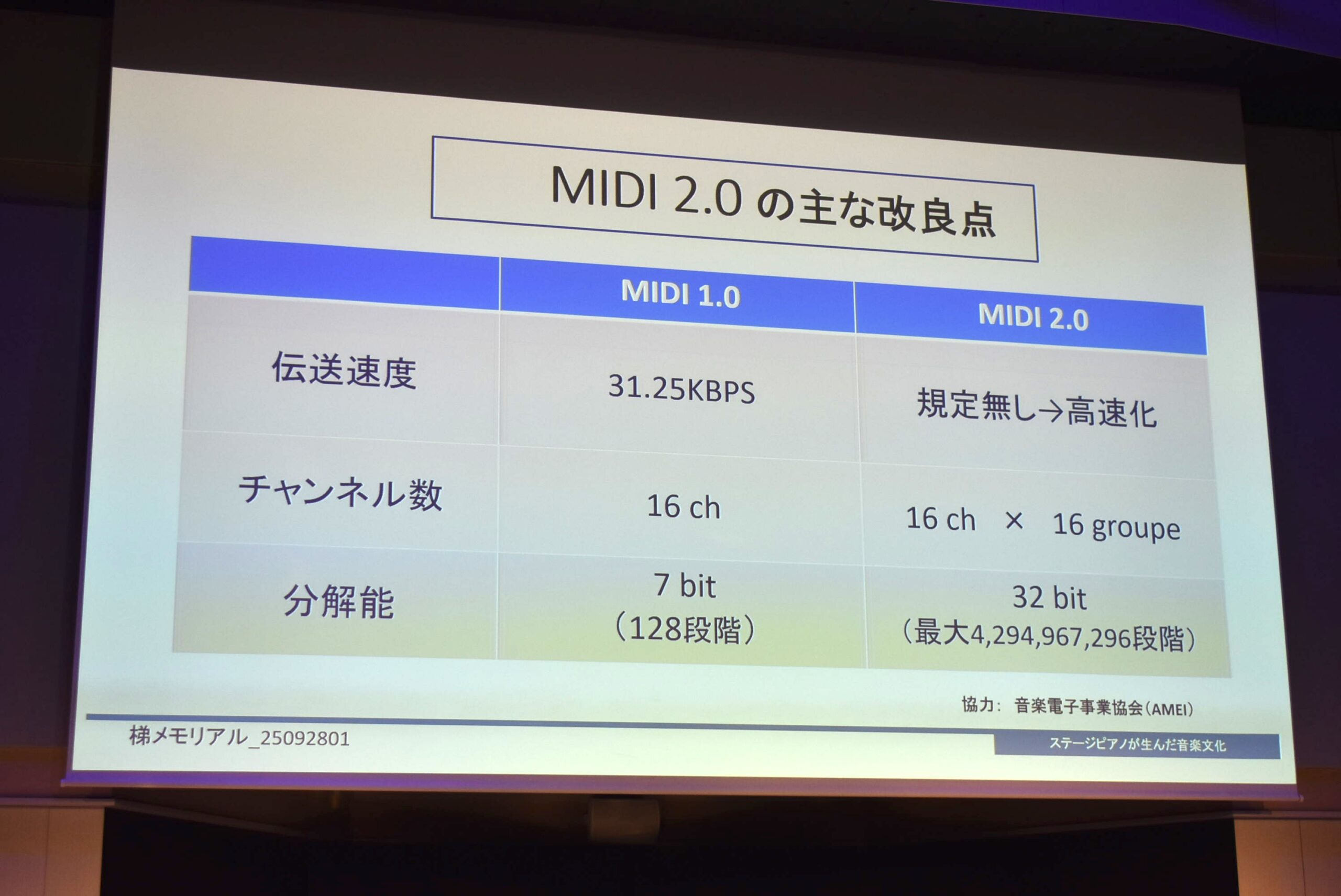 イベントの最後には、MIDI規格の策定などを行う音楽電子事業協会、AMEIが推進するMIDI 2.0についての解説もありました。特にピアノに特化した「Piano Profile」では、鍵盤を弾く深さや速度だけでなく、ノートオフの速度までもが高解像度で記録・送信できるようになるといいます。池内さんは「電子楽器のための新しい技術というのは世の中にはなく、世の中の新しい技術をどう楽器に取り込むかが我々の使命」と語りました。