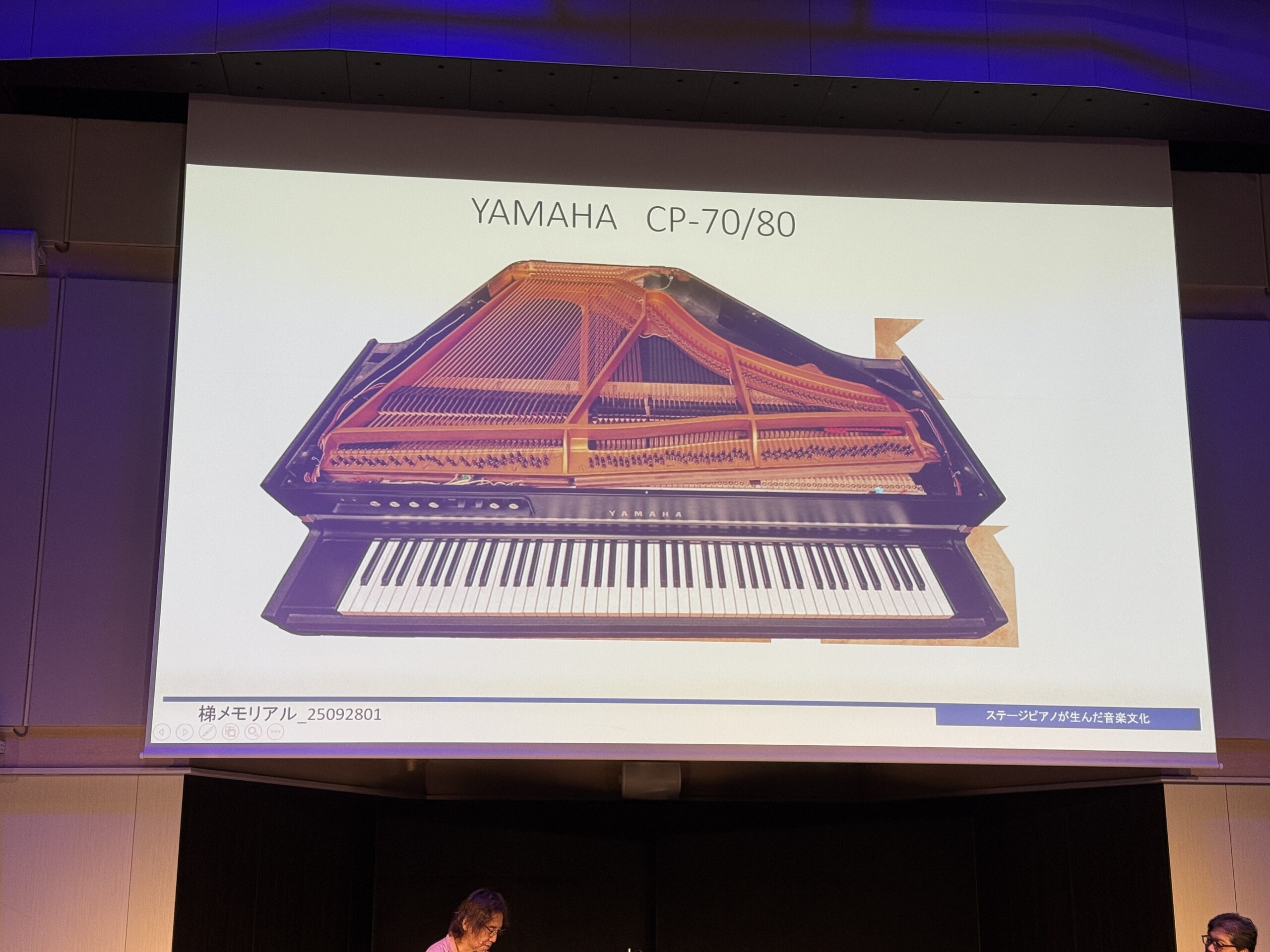 続いてのテーマは、1970年代後半から80年代にかけて一世を風靡したヤマハのCPシリーズです。ここで元ヤマハの小島高則さんと、ミッキー吉野さんが登壇しました。CP70やCP80は「エレクトリック・グランド」とも呼ばれ、本物の弦とハンマーアクションを持ちながら、ピックアップで音を拾う構造になっています。