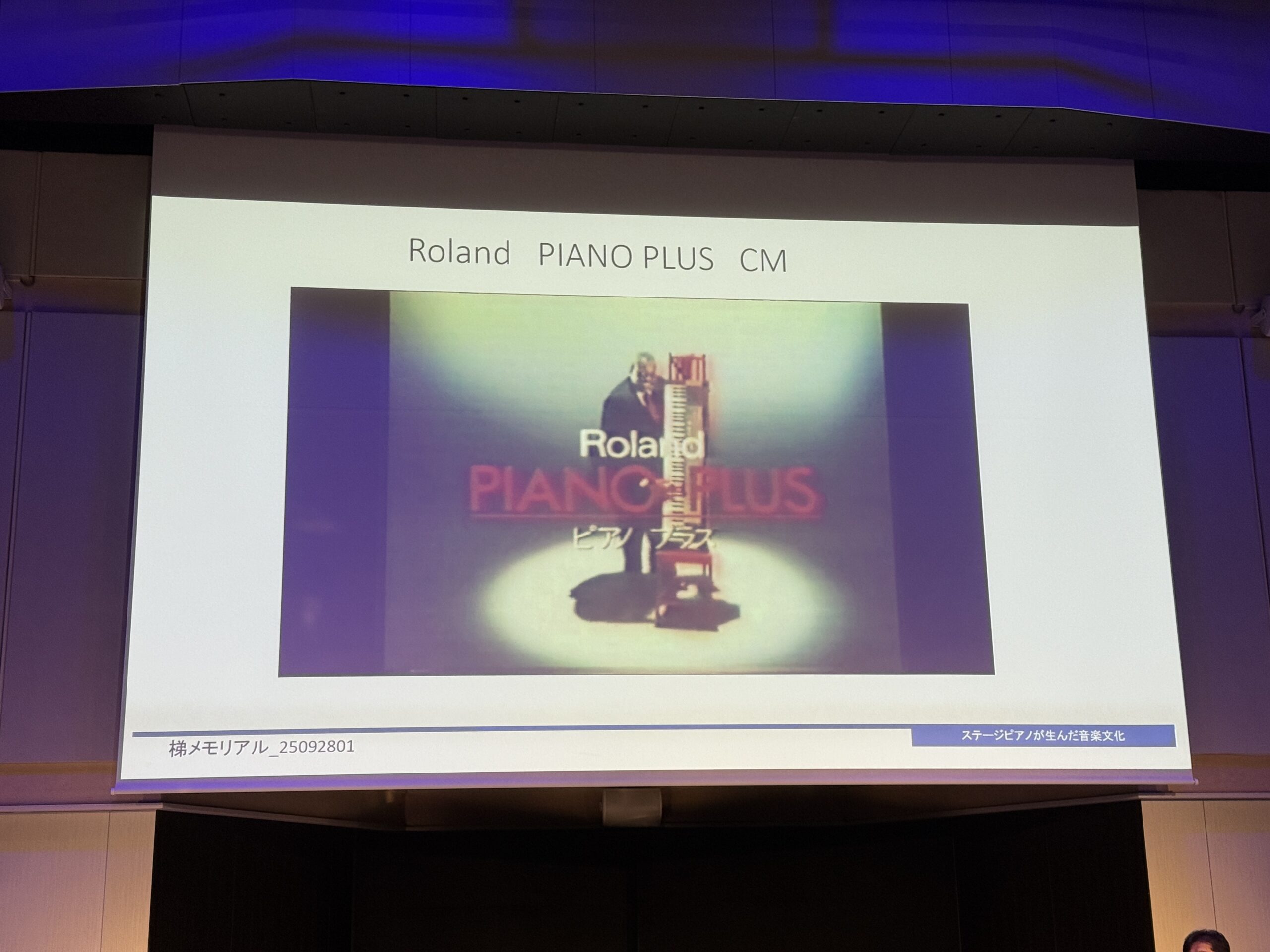 時代は進み、物理的な弦を叩く打弦式から、デジタル技術を用いた電子ピアノへと移行していきます。ここで登場したのは、元ローランドの飯村泰弘さんです。まずは、ローランドが電子ピアノ市場に参入した際の伝説的なCM、ジャズの巨匠オスカー・ピーターソンが出演した「ピアノ・プラス」の映像が紹介されました。
