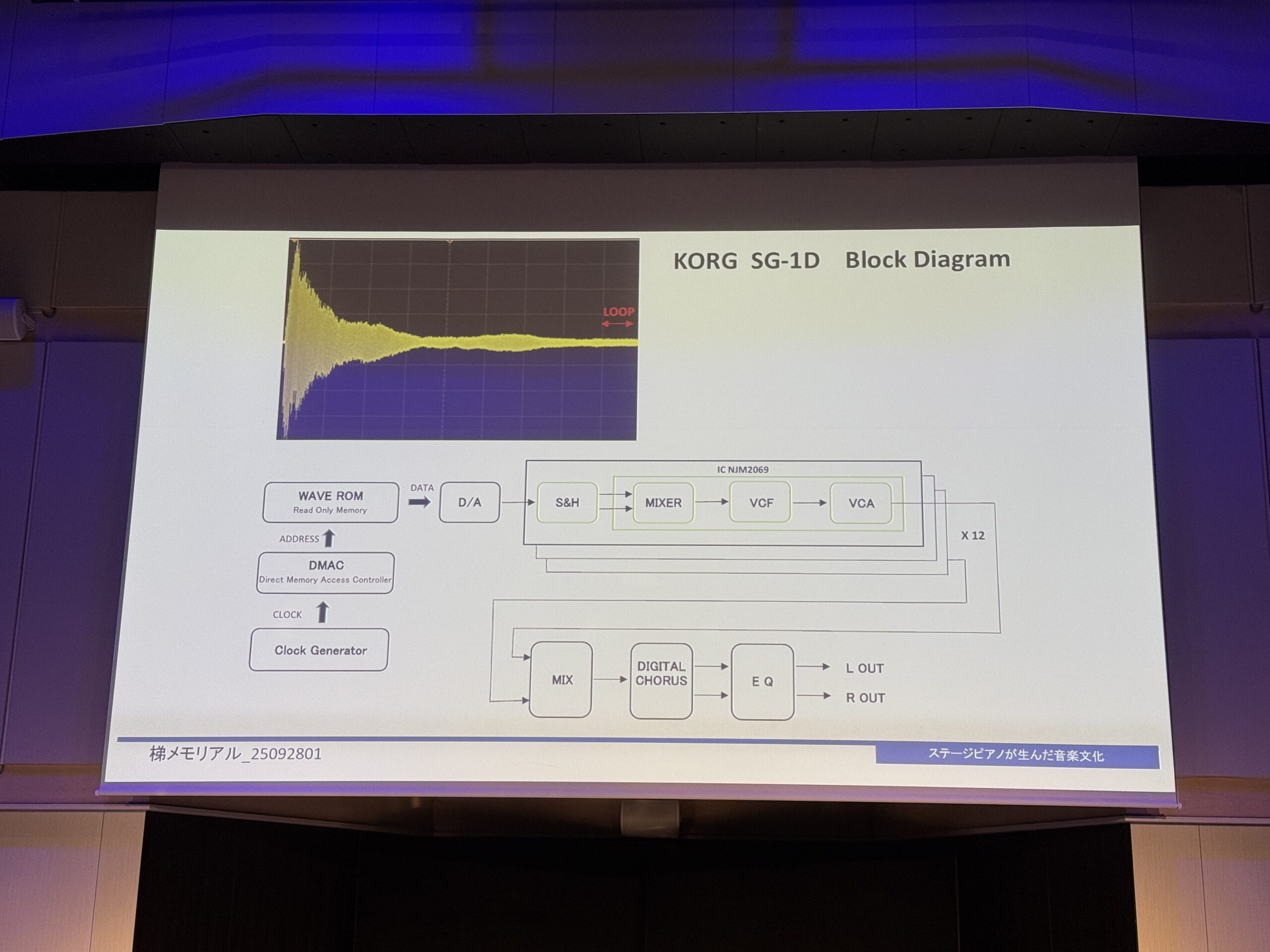 最後に登壇したのは、コルグで数々の製品開発に携わってきた池内順一さん。1981年に入社し、アナログからデジタルへの転換期を技術者として体験してきました。話題は1986年に発売されたステージピアノSG-1Dへ。これは本格的なサンプリング、PCM音源を搭載したモデルでした。