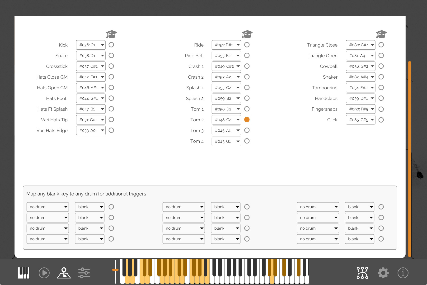 他のドラム音源の場合、独自のドラムマップを採用していることが多く、既存のMIDIパターンを使おうとすると配列を変更する必要があります。しかしHandy Drumsシリーズなら、そのままGM配列で演奏できるため、他の音源からの乗り換えや、複数の音源の使い分けがスムーズに行えます。が、もちろん、自由にマッピングも可能であり、プリセットマネジャーを利用して、そのマッピングした情報を保存して、いつでも使うことが可能になっています。