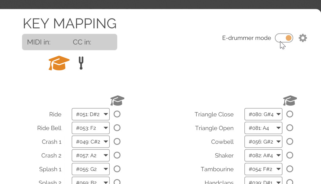 またV-Drumsなど電子ドラムの配列に合わせることも可能です。電子ドラムでの演奏を想定した「E-drummer(電子ドラム)モード」も搭載されており、DAWを起動せずにスタンドアロンで動作させて、電子ドラムやMIDIパッドで演奏を楽しむこともできます。