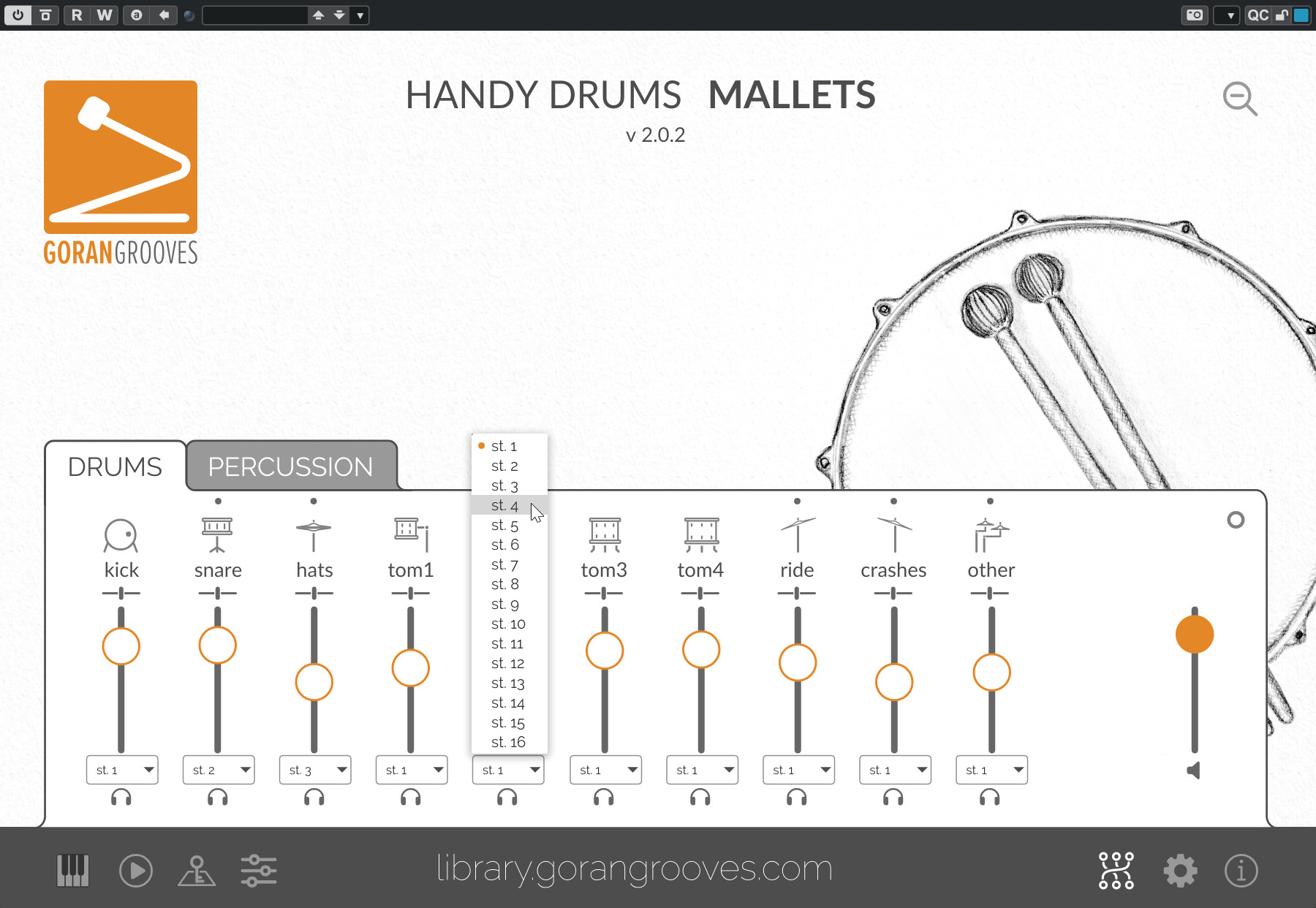 GoranGroovesのHandy Drumsシリーズは、シンプルさと実用性を両立させたドラム音源です。スタンドアロンで完結する独自のアーキテクチャにより、立ち上がりの速さと明快な使用感を実現。GM配列採用、MIDIプレビュー機能、パラアウト対応、ラウンドロビン+ランダムロビンなど、初心者からベテランまで満足できる機能も充実しています。