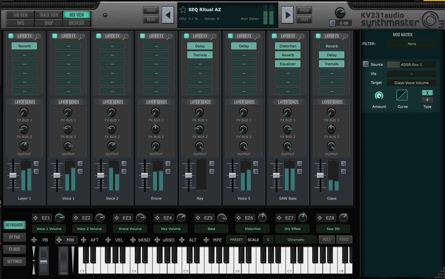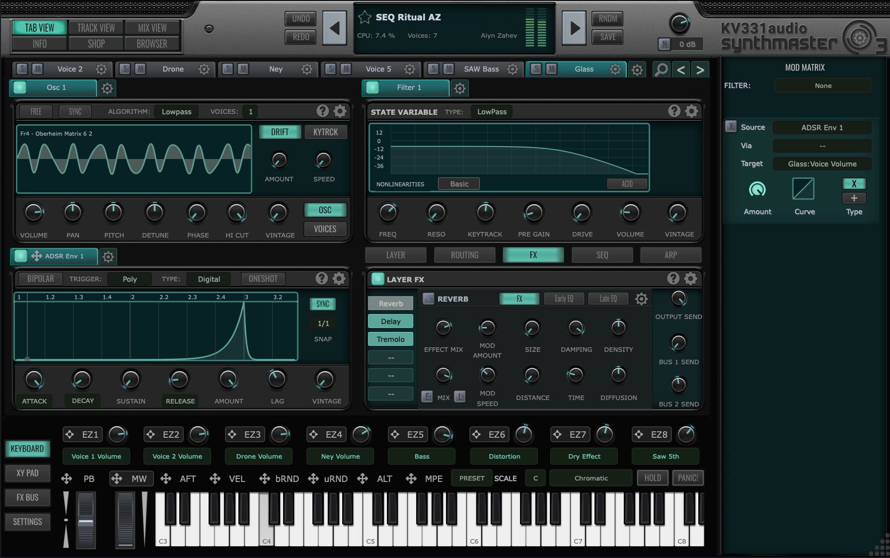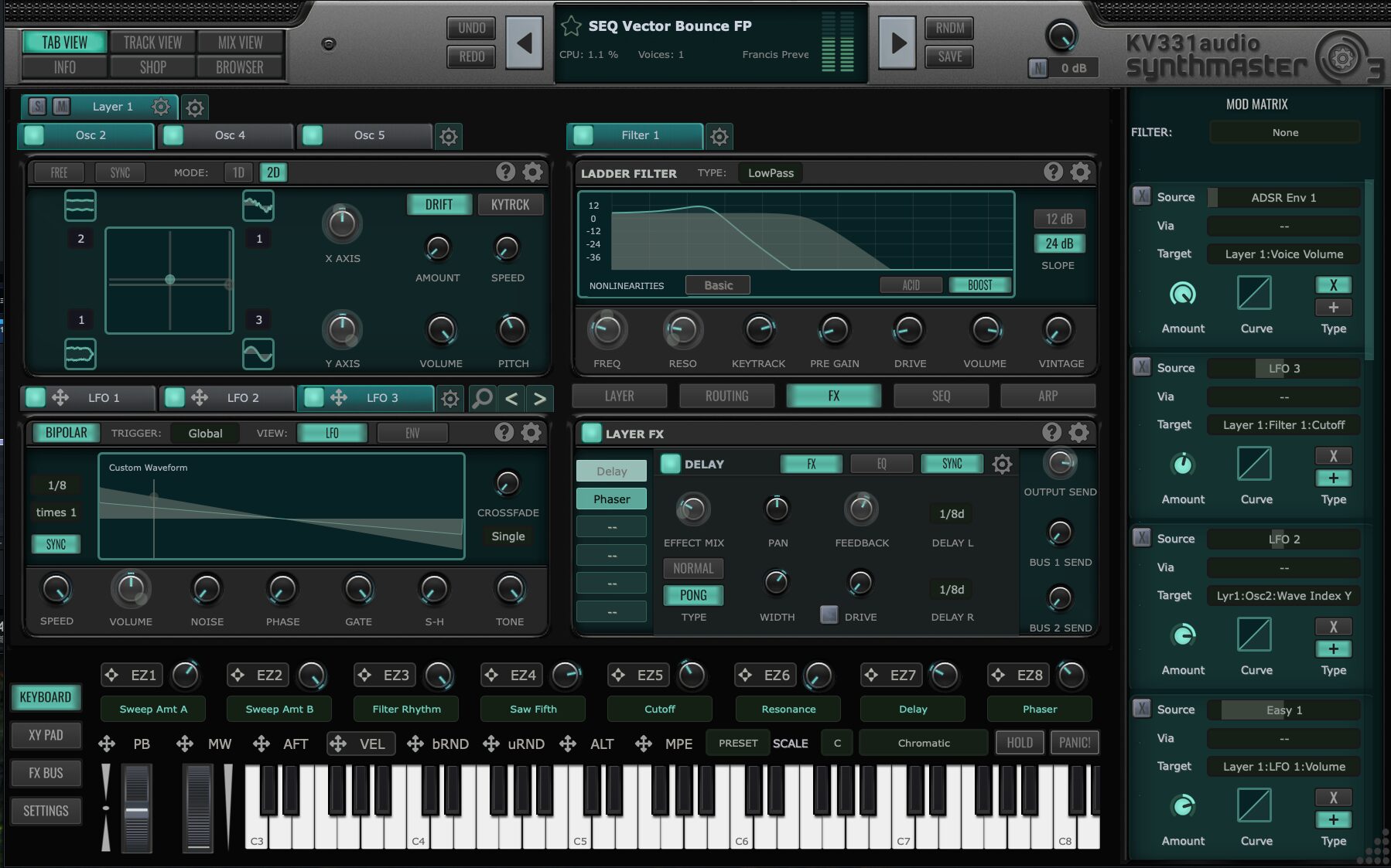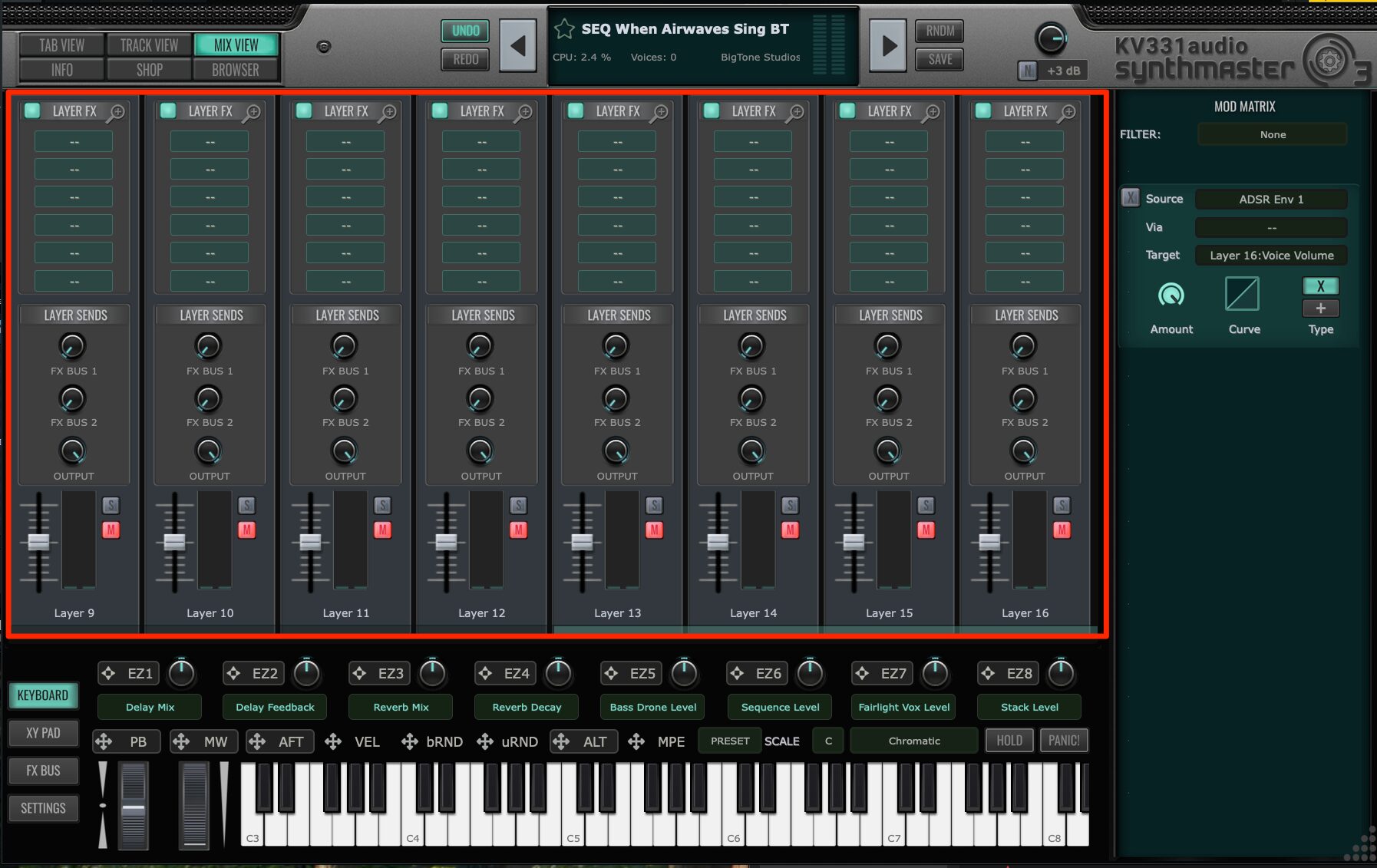 さらに驚くべきはそのレイヤー構造です。SYNTHMASTER 3では、1つのプリセットの中に最大16のレイヤーを作成可能。それぞれのレイヤーが独立したシンセサイザーとして機能しており、通常のシンセサイザでは2レイヤーや4レイヤーが一般的ですが、16レイヤーというのは桁違いのレイヤー数を作ることができます。極端なことをいえば、レイヤー1で重厚なベースを鳴らし、レイヤー2から4で厚みのあるパッドを重ね、レイヤー5でアルペジオを走らせ、さらにレイヤー6以降でキック、スネア、ハイハットといったドラムキットを展開するといったことが、これ1台で完結してしまうのです。