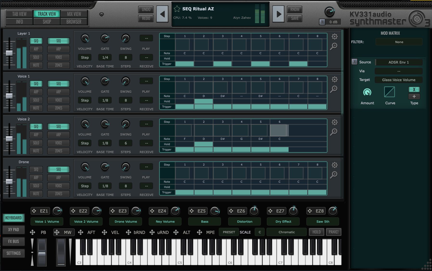 次に便利なのがトラックビュー。ここでは全レイヤーが水平リストとして一覧表示され、各レイヤーのソロやミュート、シーケンサのオンオフなどを一目で把握し制御できるのが特徴となっています。Shiftキーを使った一括操作にも対応しており、たとえばVoiceボタンをShiftキーを押しながらクリックすると、すべてのレイヤーの表示がVoiceパラメータ画面に切り替わります。複数のレイヤーの設定を比較したり、まとめて調整したりする際にいちいちレイヤーを行き来する必要がない、スピーディーなワークフローが実現されています。またリストのスクロールもマウスホイールやドラッグ操作でスムーズに行えます。