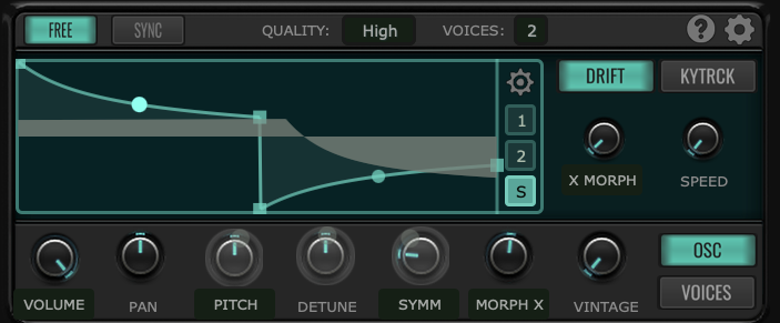 通常のアナログモデリングシンセといえば、ノコギリ波や矩形波といった基本波形や、既存の名機をシミュレートした波形を選択するのが一般的です。しかしSYNTHMASTER 3のVAnalogオシレータでは、単に波形を選ぶだけでなく、カーブセグメントを使用して波形の形状を自由にデザインすることができます。
