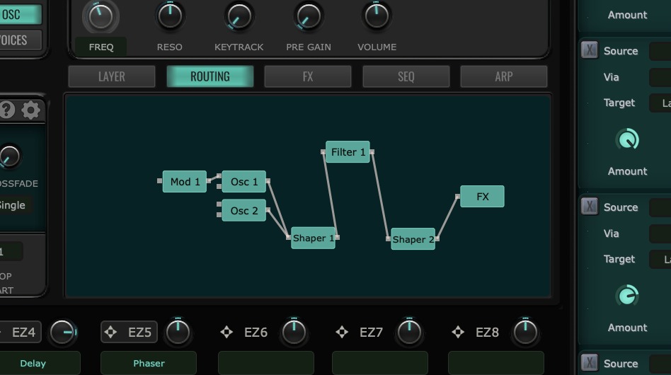 オシレータ、フィルター、モジュレータといったモジュールを、最大16個まで自由に配置することができるようになり、従来の減算合成シンセサイザの枠を超えた、ルーティングや実験的なサウンドメイクが可能になりました。たとえば複数のフィルターを直列や並列に自在に組み合わせたり、オシレータの間にエフェクト的な処理を挟み込んだりといったことが、パッチケーブルを繋ぐような感覚で、UI上で行えるのです。それぞれのモジュールが独立しているため、オシレータ1にはこのフィルターをかけたいけれど、オシレータ2はバイパスしたいといった処理も思いのままです。
