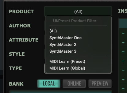 また過去のSYNTHMASTER 1およびSYNTHMASTER 2のプリセットも読み込むことができるため、ブラウザ上には製品ごとのフィルターが用意されています。SYNTHMASTER Oneをクリックすればそれ専用のバンクやプリセットが表示され、SYNTHMASTER 2を選べばそのライブラリにアクセスできるため、過去の資産が無駄になることはありません。