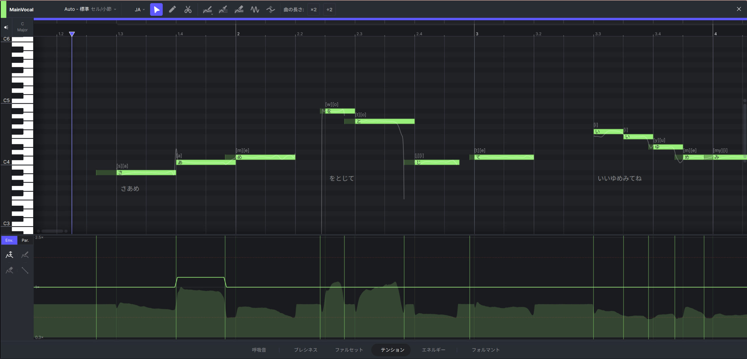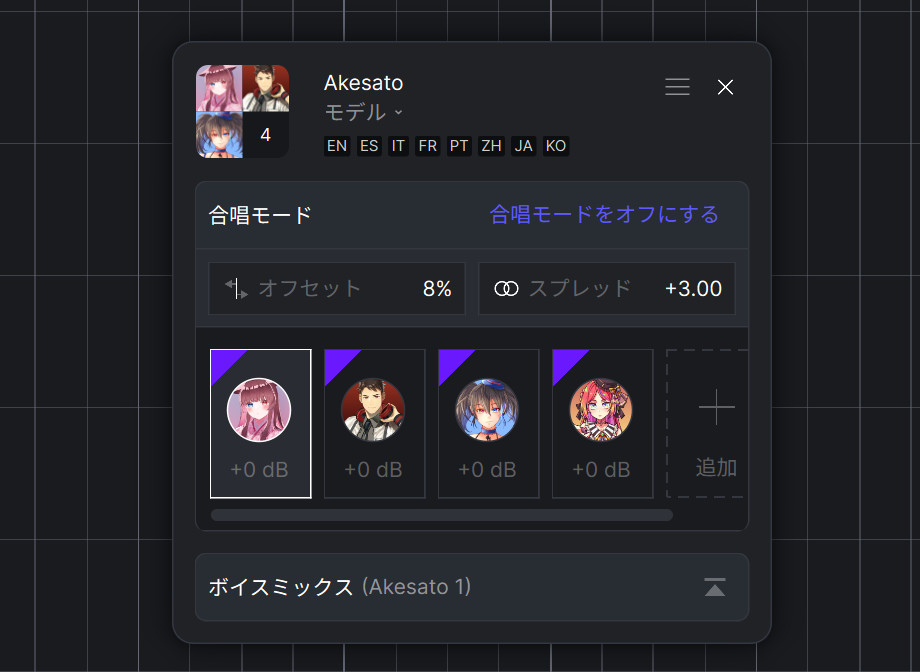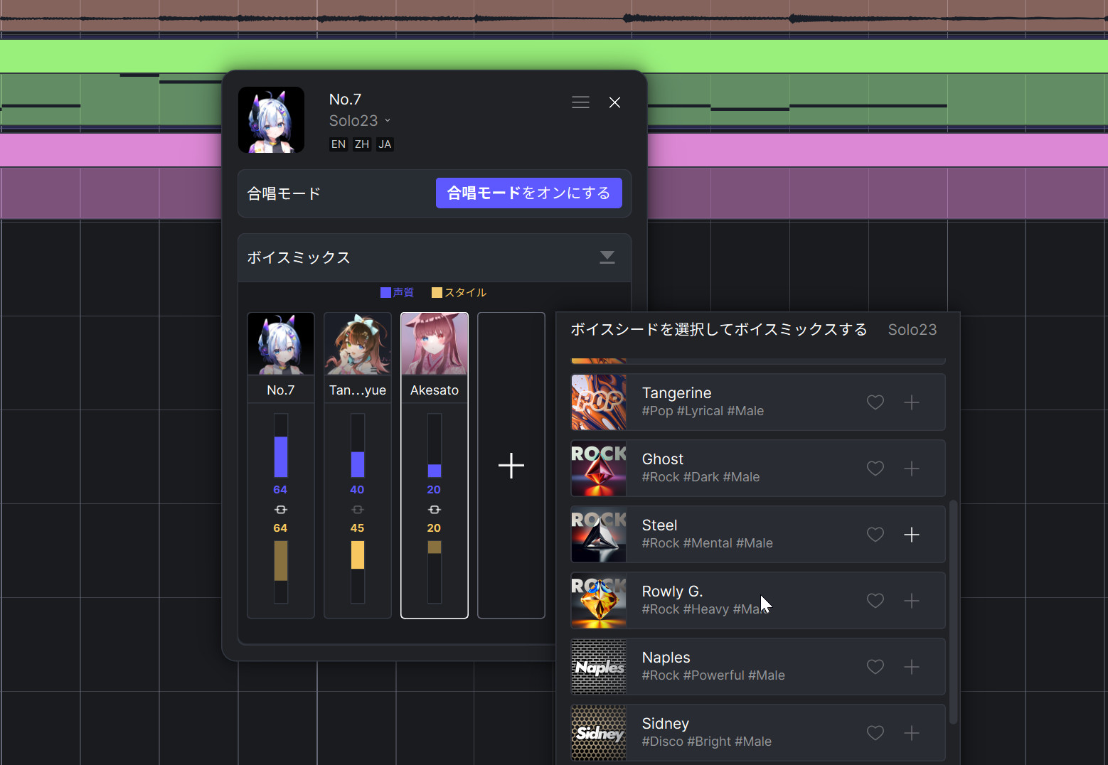 また、ボイスミックス機能によって、複数のキャラクタの歌声をモーフィングさせるような感じで混ぜ合わせることができるほか、合唱モードというものを用いて、1つのトラックの入力で複数のシンガーに歌わせることも可能になっていたのも面白いところでした。