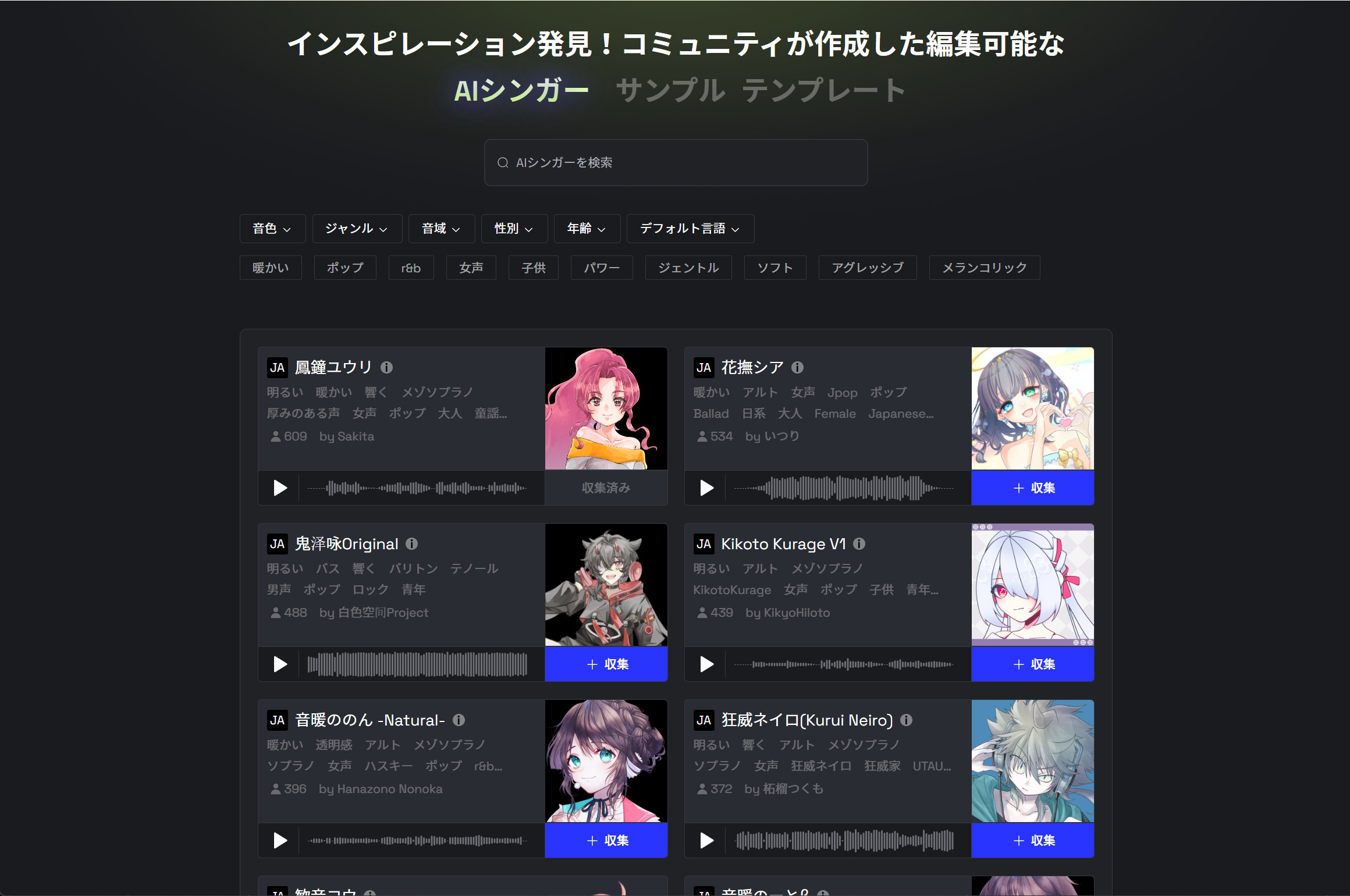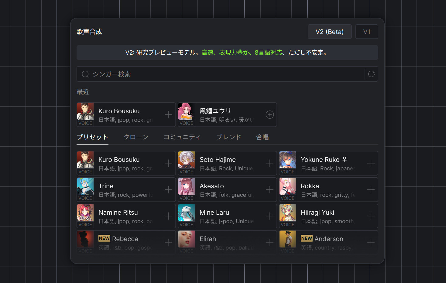 さらに、創作コミュニティーなる機能が追加され、ユーザーが作ったさまざまなデータをユーザー同士で共有できるようになったも大きなポイントです。その創作コミュニティーの中にAIシンガーコミュニティーなるものがあり、2025年12月28日現在で、日本語の歌声DBだけで29種類、他言語も含めれば99種類を自由にダウンロードし、商用においても権利フリーで自由に使うことが可能となっています。