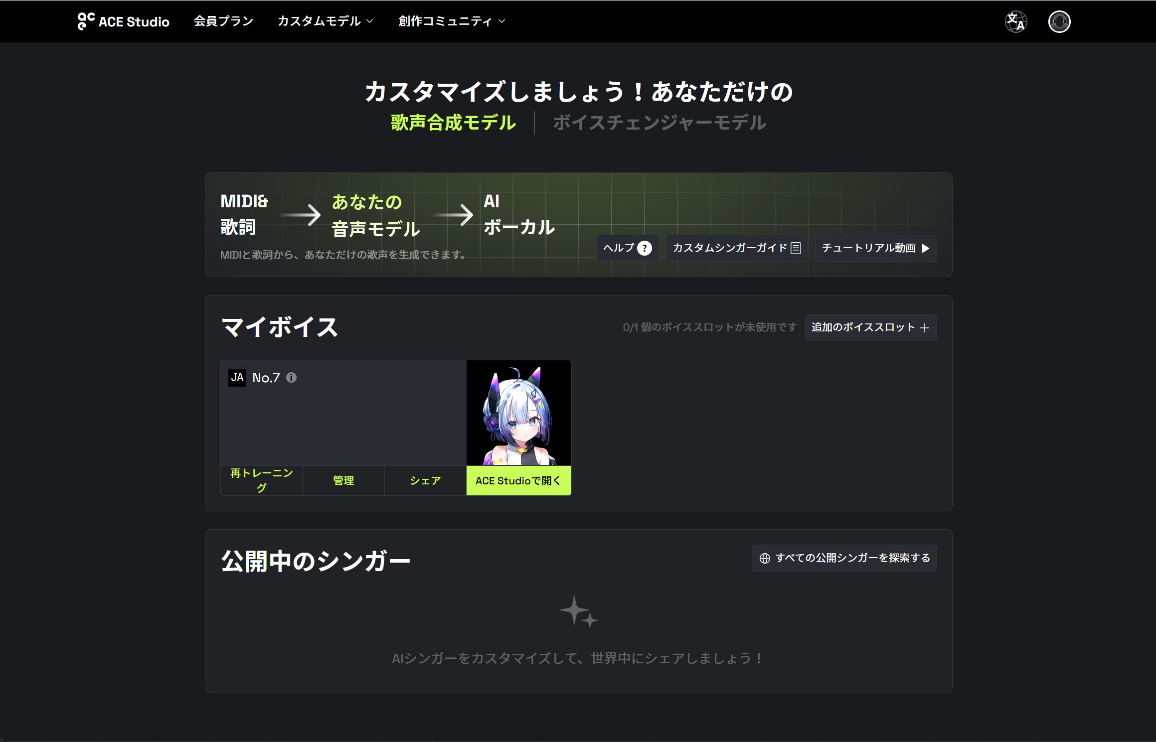 さらに注目なのが、ユーザー自身のボーカルサンプルから独自のAI歌声モデルをトレーニングできるカスタムボイス機能を搭載している点です。これにより、自分だけのオリジナルなAIシンガーを作り出すことができるのです。この点については初回の記事でテストしているので、そちらも参考にしてみてください。