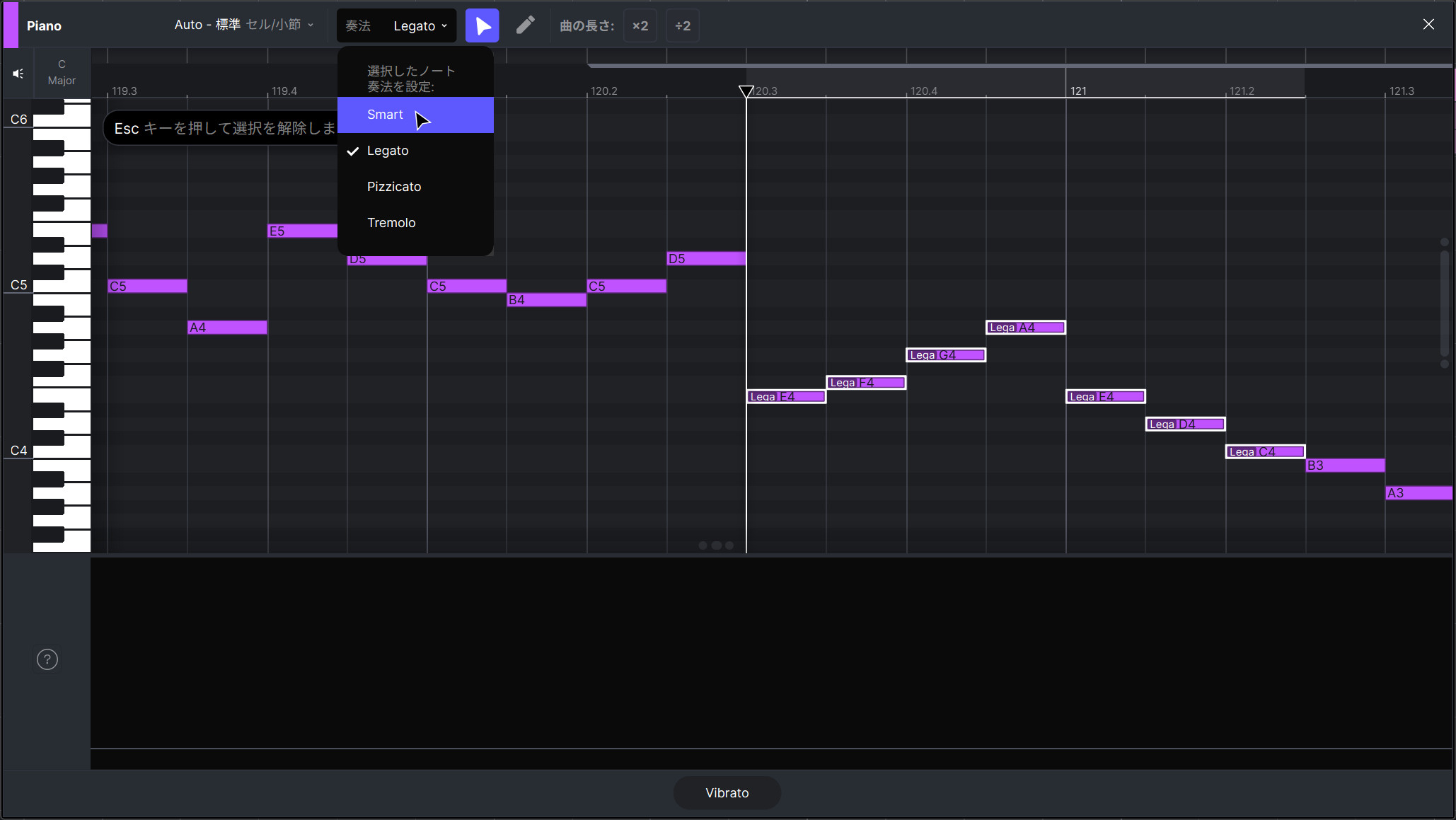 これらのアーティキュレーションは、ピアノロール上で直感的に指定できます。特定の音符からここまでをレガートにする、といった指定が簡単に行えるのです。