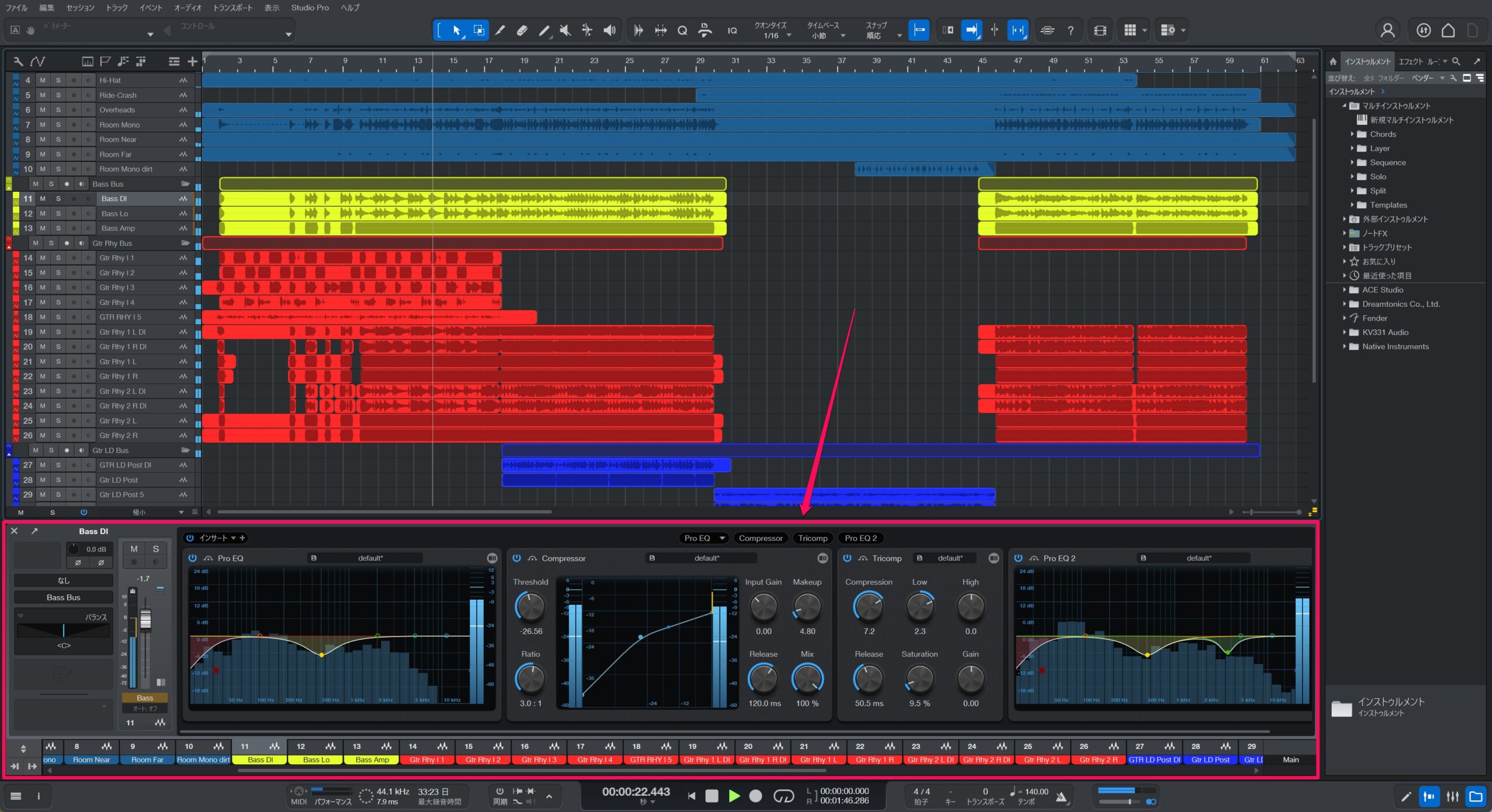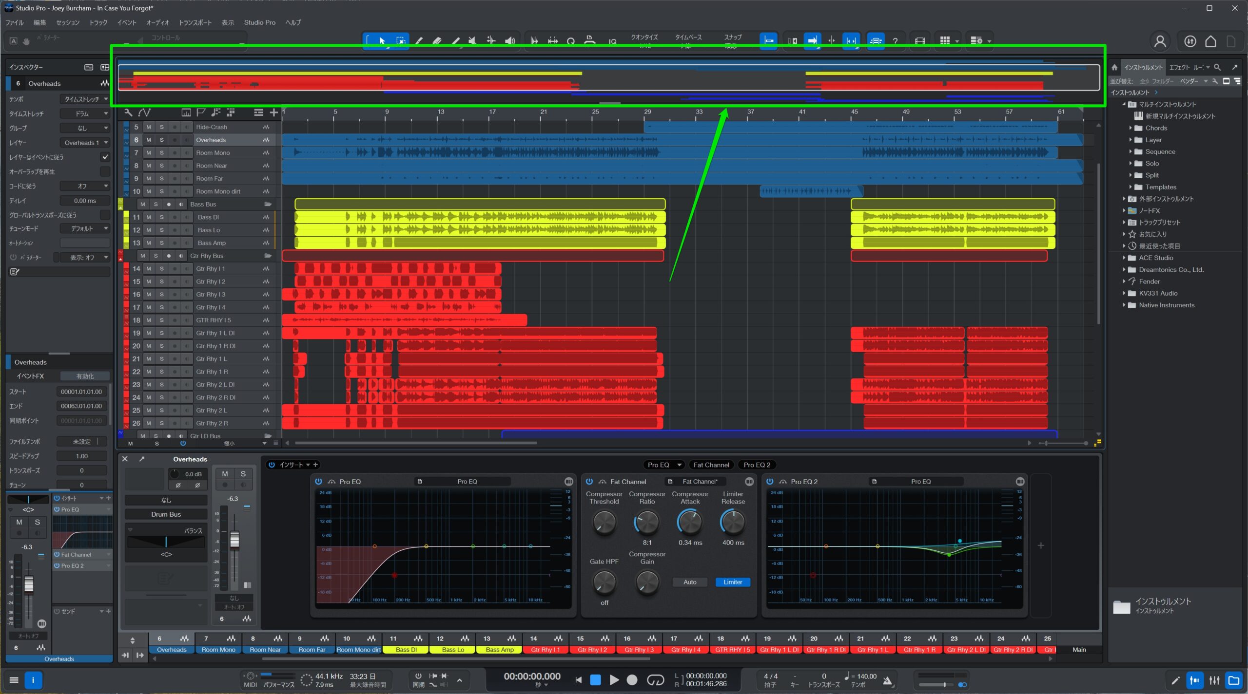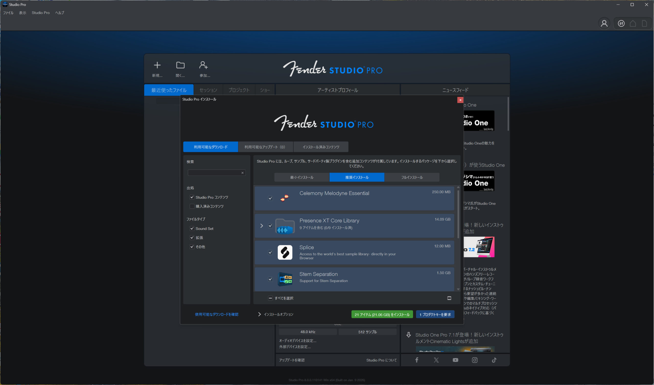 実際に起動してみると、Studio Oneユーザーならすぐに「なんだ、同じだ…」と思われると思います。起動して最初に現れるインストール画面もロゴが変更されただけだし、基本的な操作体系、ウィンドウレイアウト、ショートカットキーなど、これまで培ってきた操作感はそのまま継承されています。Studio Oneという名前が消えてしまったことには、寂しさを感じるのは事実ですが、既存のStudio Oneユーザーにとって、操作感の連続性は保たれながら、新しい機能が有機的に統合されているのがFender Studio Proの特徴といえそうです。
