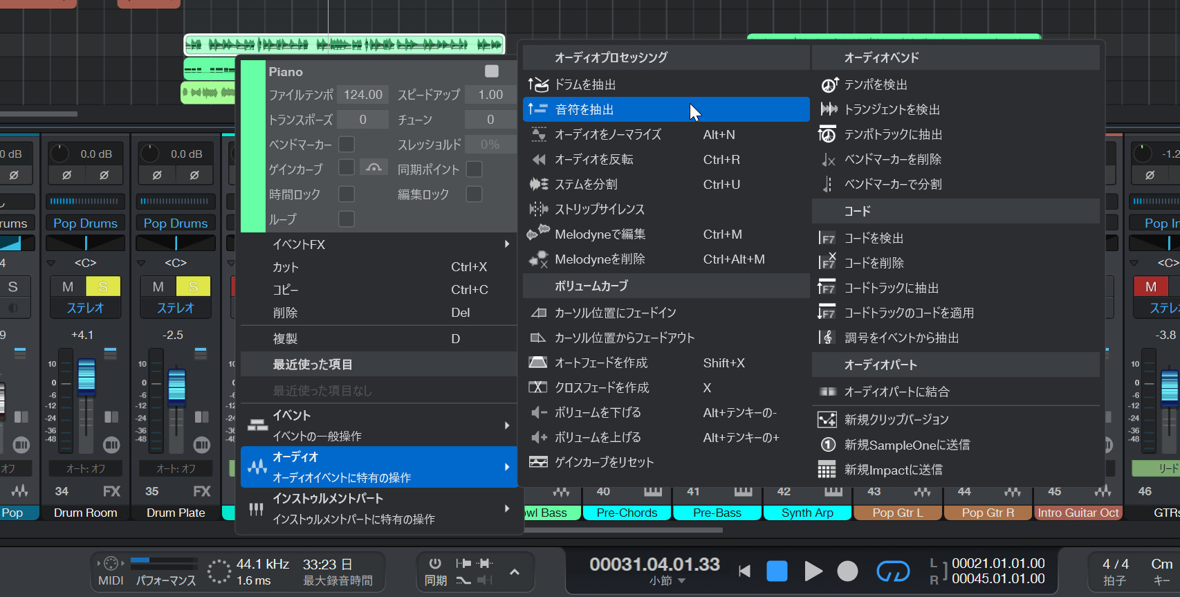 最先端のAIと機械学習テクノロジーを用いた新しいオプションとして、「音符を抽出」と「ドラムを抽出」が追加されました。これらの新機能はそれぞれ独自のモデルに基づいており、オーディオデータを分析し、音符やリズム、イベントを識別します。
