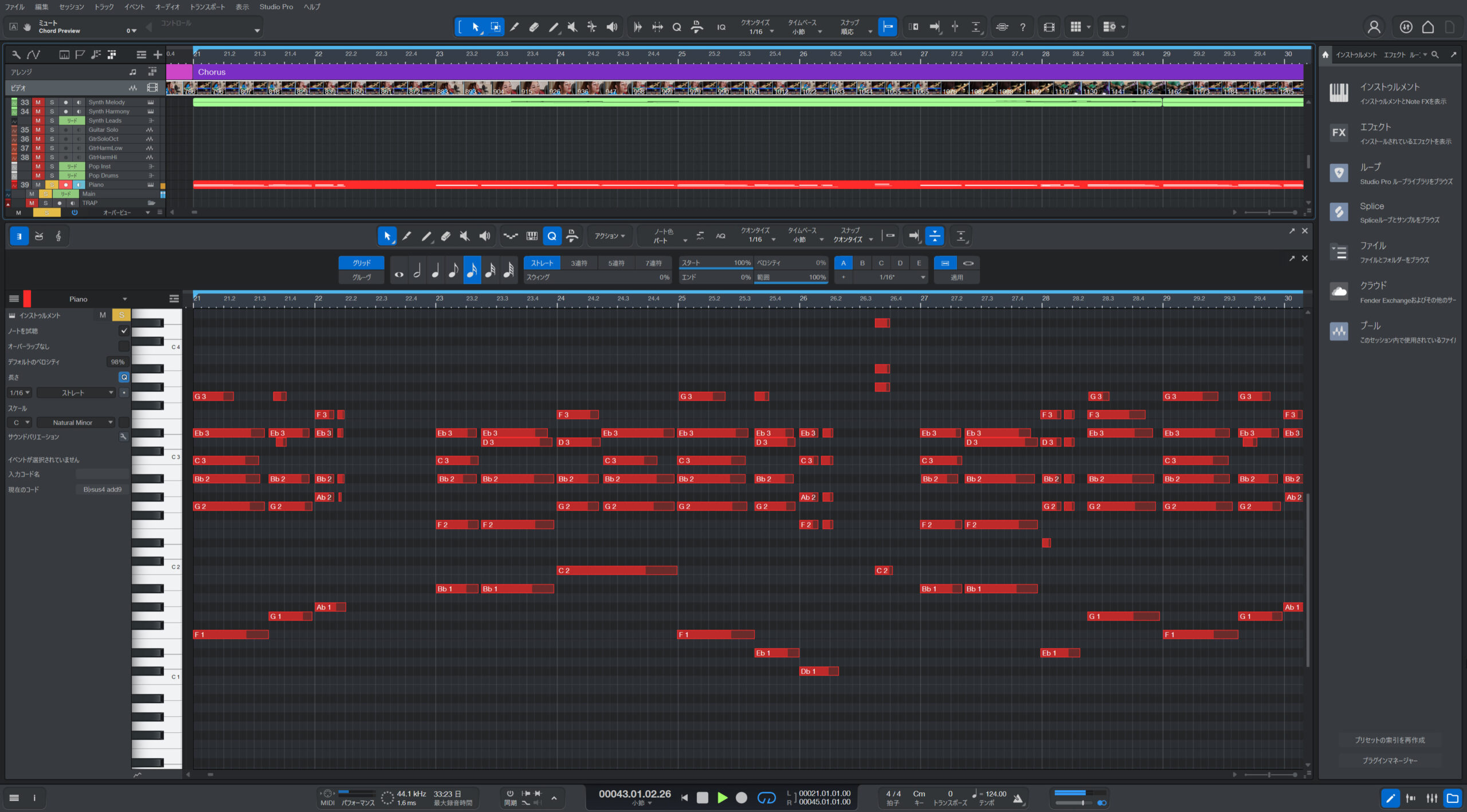 Fender Studio Proでは、コードアシスタントというものが追加され、コードトラックがさらにパワフルなものになりました。コードアシスタントは、既存のコード進行に基づいてコードをレコメンドしてくれる、というもの。既存のコードやコード進行の隣に新しいコードを追加するだけで、確率的モデルに基づいて何千ものコード進行から構築されたコードが割り当てられます。