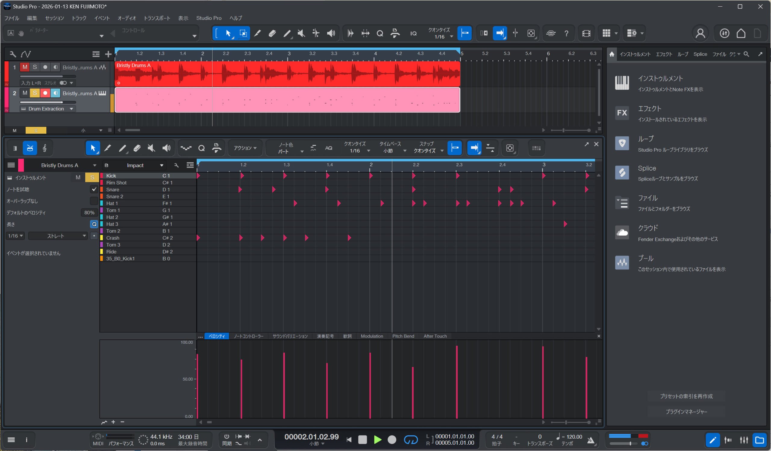 一方、ドラムを抽出はアコースティックドラムに特化してラーニングされたものとのことで、こちらは4小節のドラムループ素材を使って試してみました。やはり新たにインストゥルメントトラックが作成され、デフォルトではImpactがアサインされた形で、MIDIデータが生成されます。