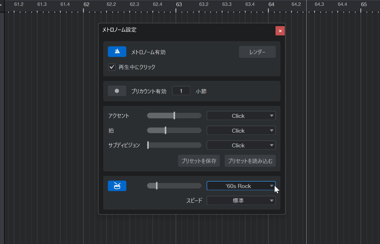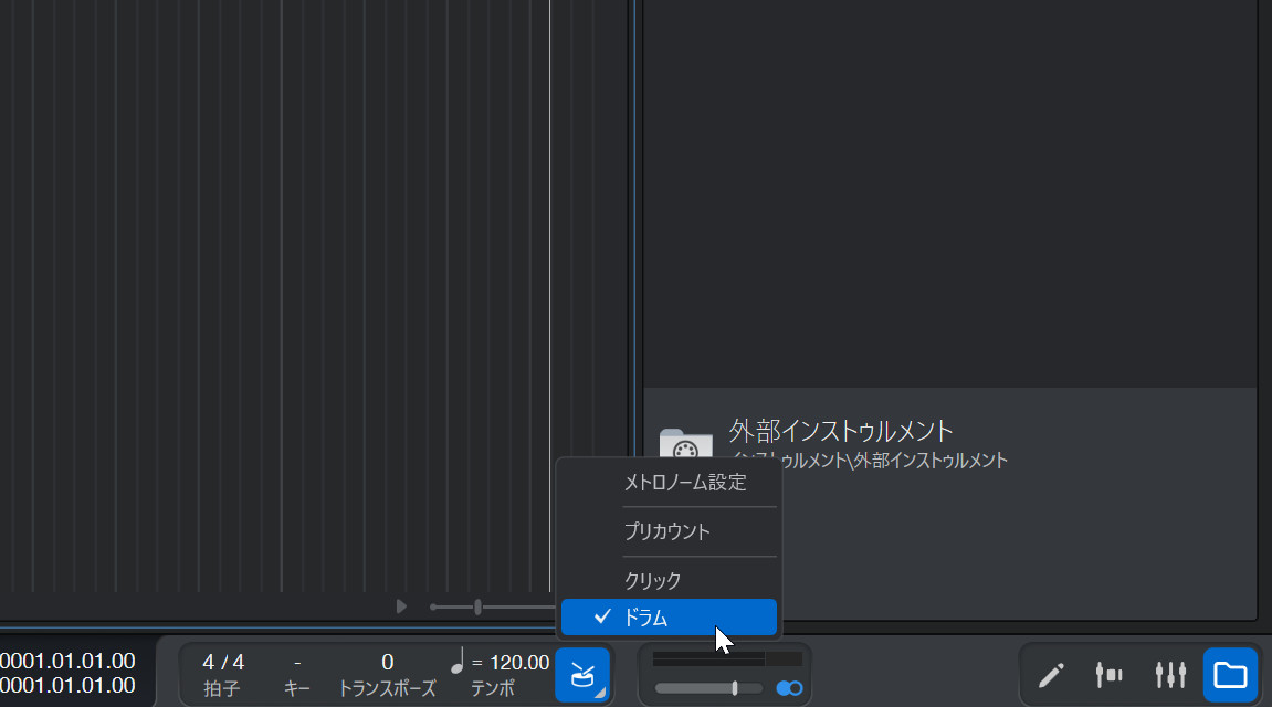 最後に紹介する新機能がDrum Metronomeです。演奏用にクリックを聴く代わりに、もう少し雰囲気の出るドラム音で演奏したい、といったときに簡単に設定できるとっても便利なものです。ドラム・パートを作成する前にとりあえずアイデアを録音する際などに使えそうです。