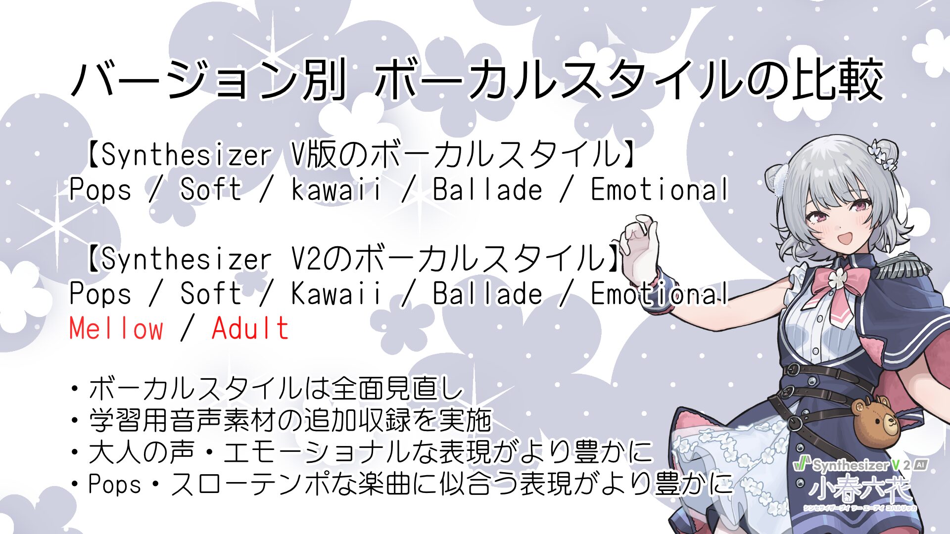 アカサコ:小春六花については、2つのテーマを持ってアップデートしています。1つ目は「大人の表現の強化」、そして2つ目が「元々得意だった明るくて元気なPopsの表現力の強化」です。新たにMellowとAdultという2つのスタイルが加わりましたが、両方とも大人の雰囲気を持っています。Mellowは名前の通り少し柔らかい声質で、Adultはより大人な感じをイメージして制作しました。