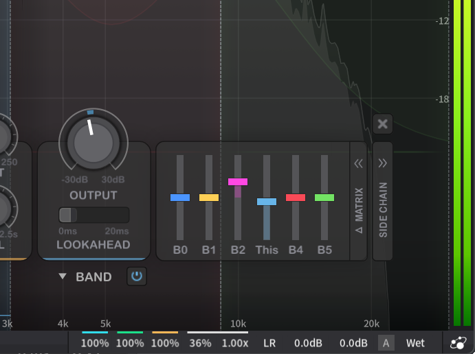 これによって、バイパスと比較したときも、バンドのパラメータを調整したときも、常に「ラウドネスの差なし」な状態で処理の効果だけを耳で確認できます。ミキシング判断の精度が格段に上がるのはいうまでもありません。