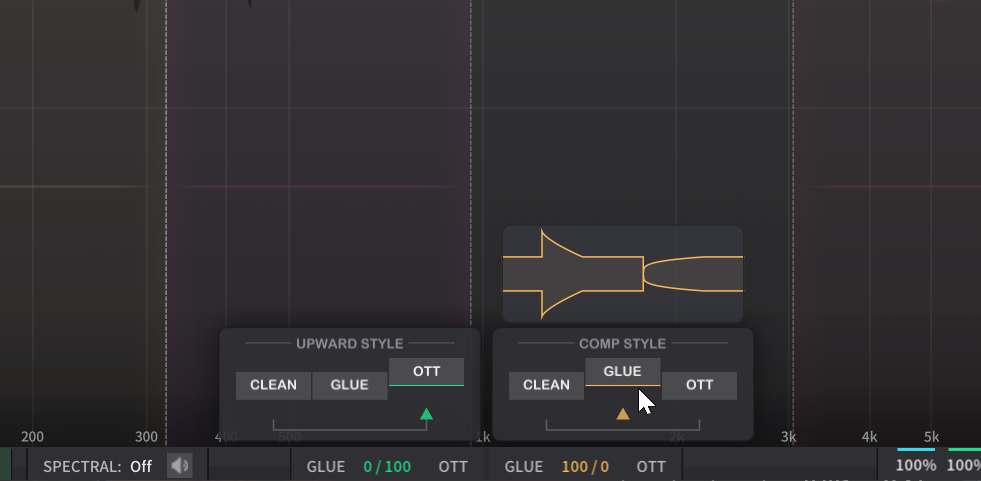 各バンドのダイナミクス処理には、3種類のキャラクター(Clean、Glue、OTT)が用意されており、それらをノブで連続的にモーフィングしながら使えます。プラグインを切り替えたりプリセットをスクロールしたりする必要はなく、ノブを回すだけでCleanの透明感からGlueのヴィンテージ的なまとまり感、そしてOTT的な過激なサウンドデザインまで、リアルタイムで行き来できます。