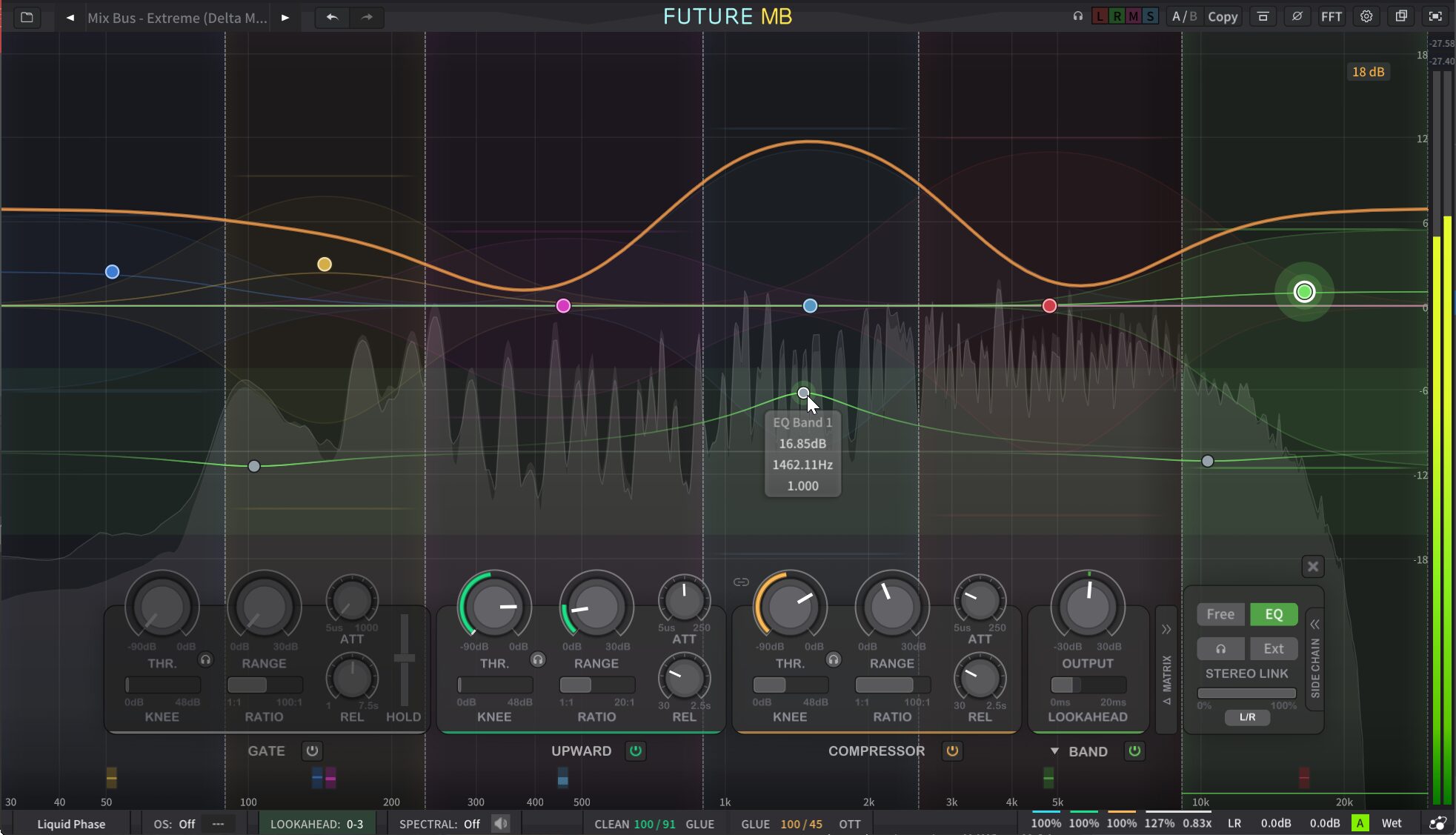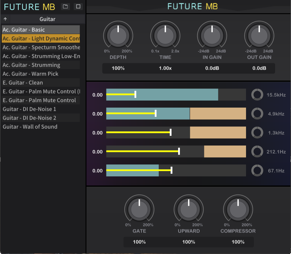 Gateは余韻やスピルを整理するのに使いますが、特にユニークなのがUpward(アップワードコンプレッション)の設計です。通常のアップワードコンプはノイズフロアも一緒に持ち上げてしまうという欠点がありますが、FUTURE MBでは独自のDual-Threshold設計を採用。2つのスレッショルド間にある「音楽的に意味のある小さなサウンド」だけをブーストし、それ以下のノイズフロアには一切手をつけないという精密な制御を実現しています。ボーカルのブレスや、スネアのゴーストノートを、クリーンに引き出すことが可能です。