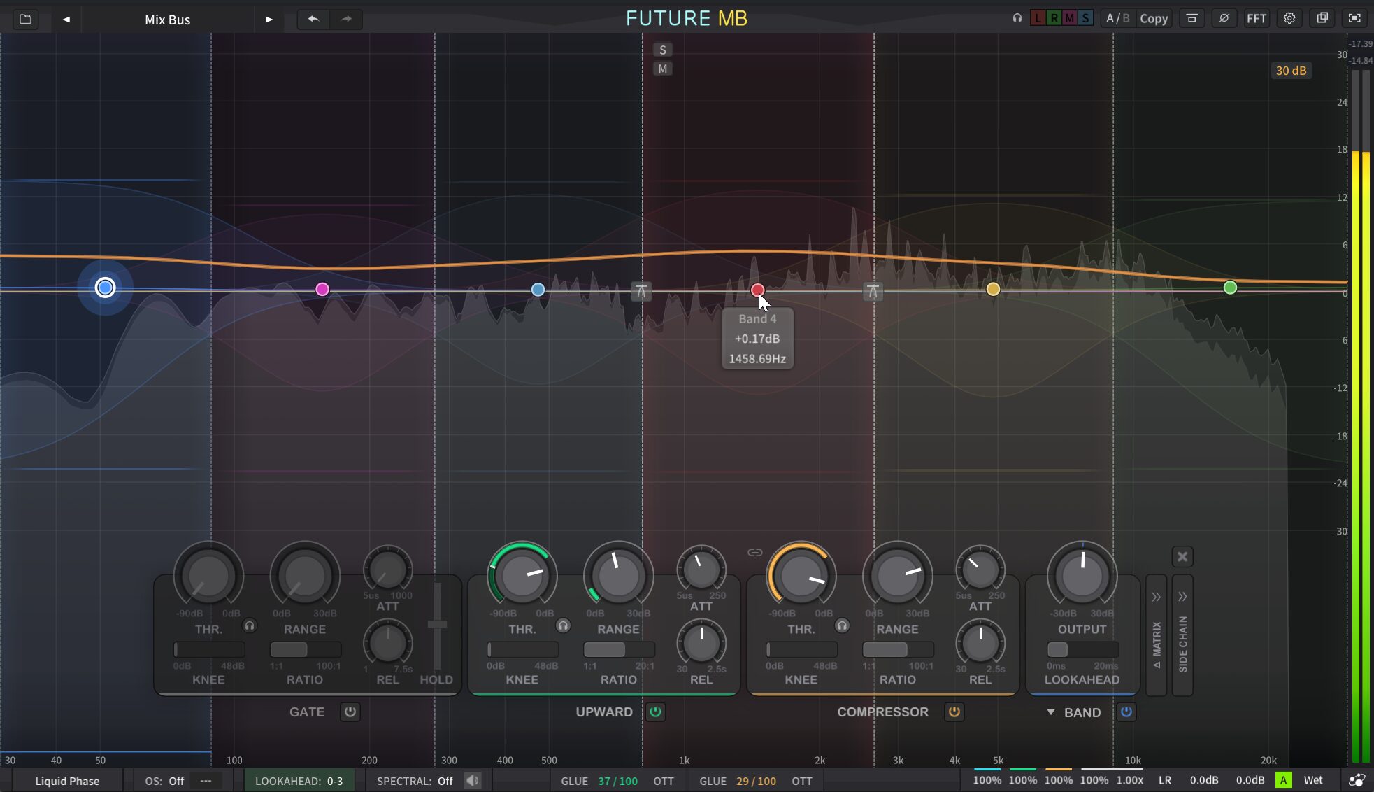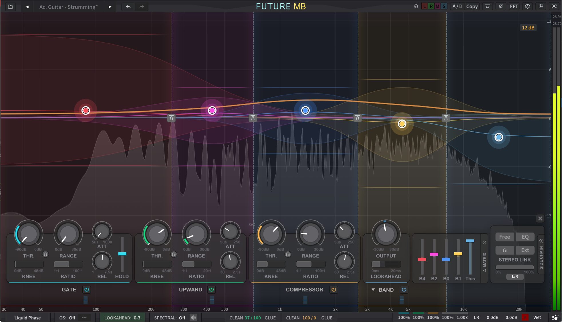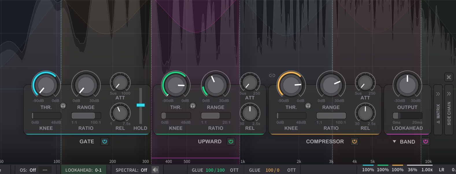 FUTURE MBのもう一つの大きな特徴は、全バンド3段階のダイナミクス処理エンジンが搭載されている、という点です。具体的にはGate、Upward / Spike、Compressor / Duckingという3つのステージを、各バンドごとに独立してオン・オフできます。