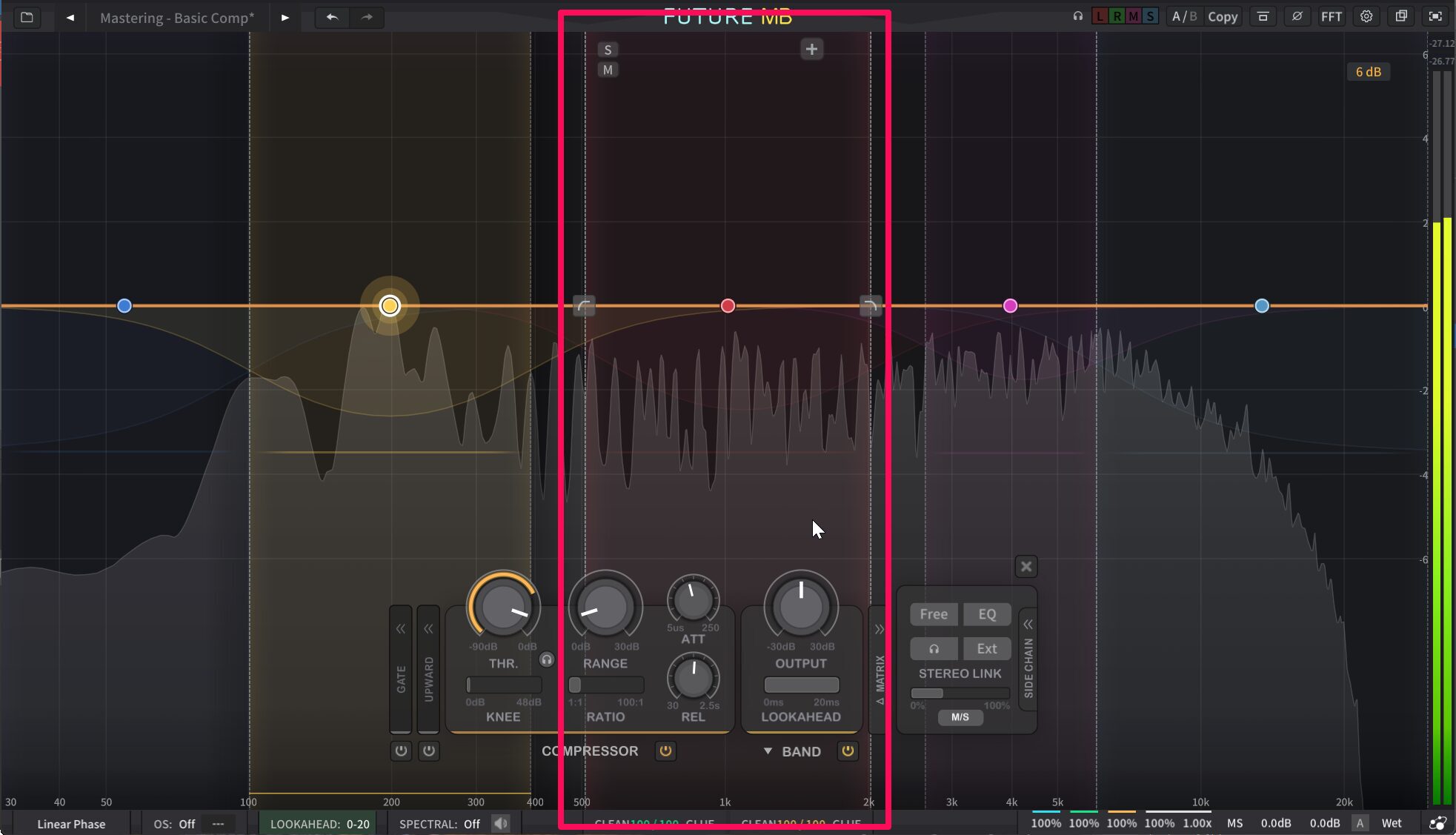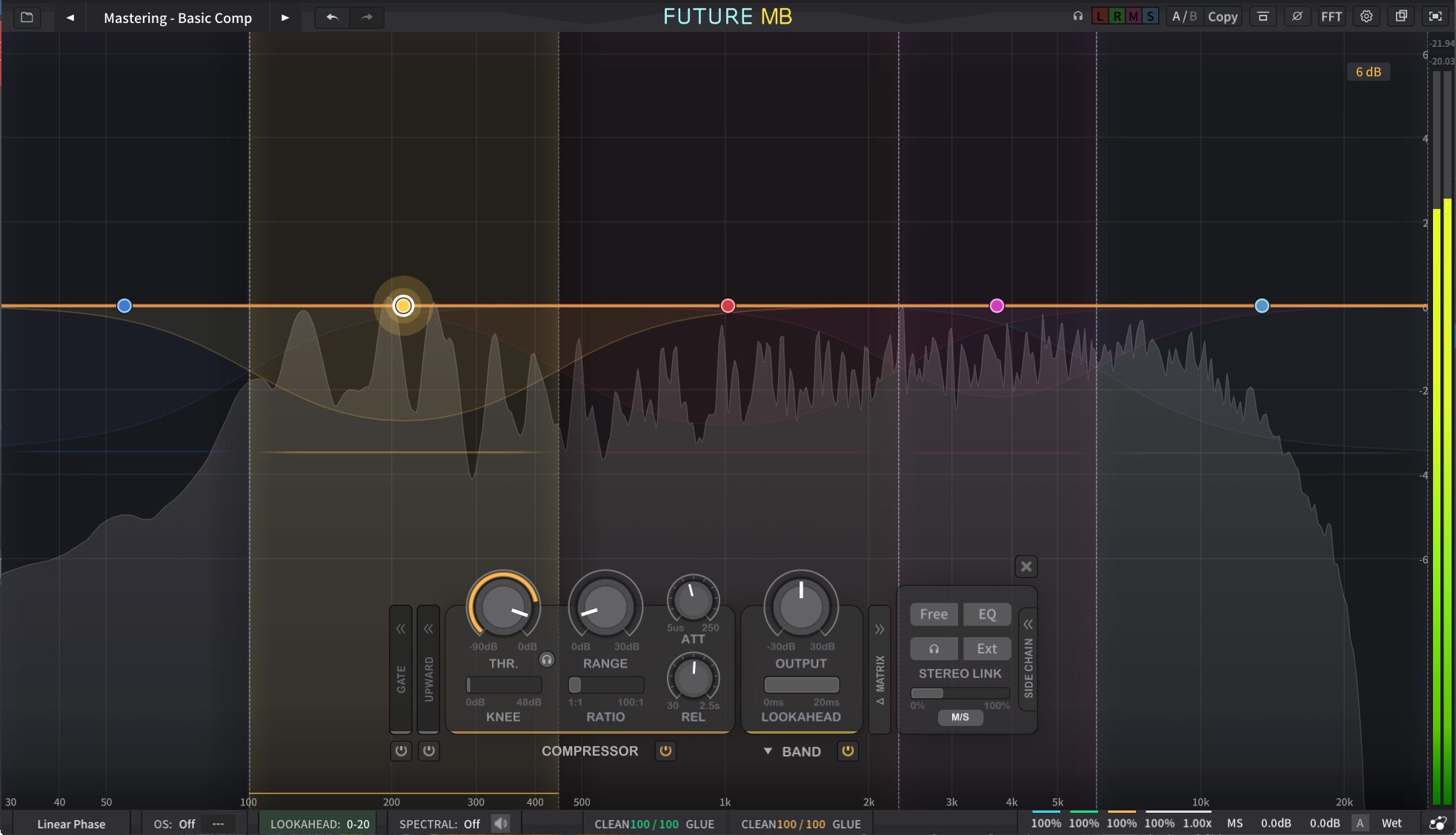 FUTURE MBはその制約を根本から取り払っているというのが最大の特徴となっています。スペクトルを強制的に分割するのではなく、ユーザーが必要と感じた場所に最大6つの独立したダイナミクスバンドを自由に配置できるのです。各バンドは「孤立した処理ゾーン」として機能させ、残りの帯域に影響を与えずにピンポイントで処理することも、バンドをスナップしてつなげ従来型のクロスオーバーネットワークとして使うことも可能です。さらにクロスオーバーのスロープは6dB/octから48dB/octまで幅広く設定でき、音楽的な滑らかさからサージカルな分離まで、自在に使い分けることができます。