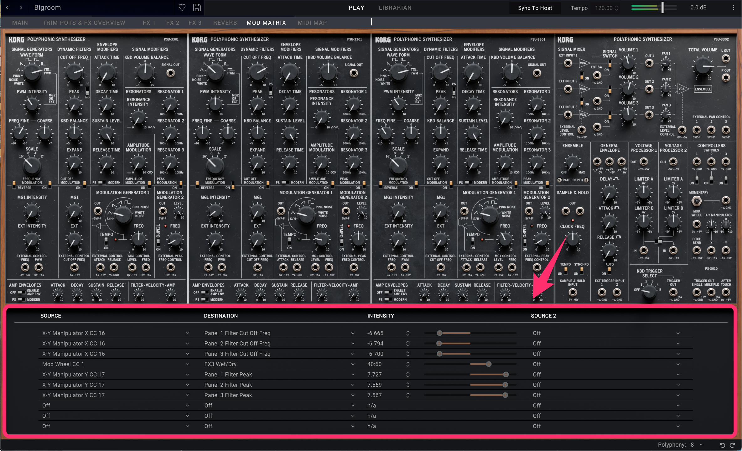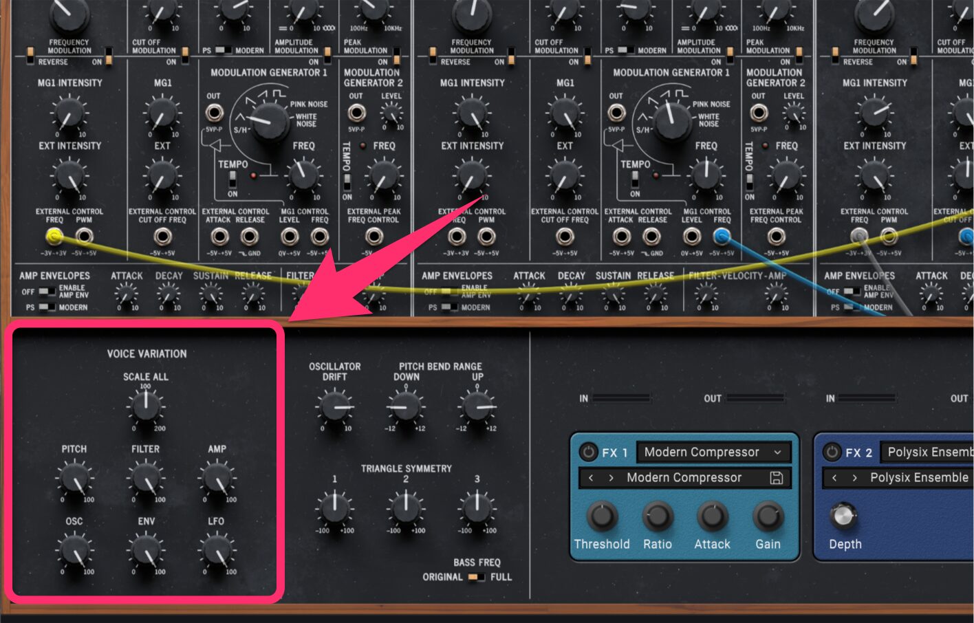 ノイズの扱いにも工夫を加えました。ビンテージのPS-3300はノイズ信号を直接オシレーターソースとして使用できませんでした。クラシックなPS-3300のプログラムでは、LFOのノイズをオーディオレートでピッチやフィルターにモジュレーションすることで「息感」や「コーラス感」を作り出していました。これ自体は非常に独創的なアプローチで興味深い結果を生みますが、今回はメインLFOのホワイトノイズとピンクノイズをオシレーターの波形選択としても使えるようにしています。