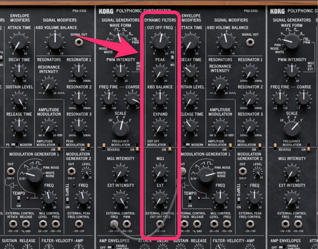 このフィルターはKORGのPSシリーズ以外には使用されておらず、私たちが知る限り、学術論文を含めて一度もデジタルモデリングされたことがありませんでした。KORG Collection PS-3300が世界初のモデリングです。我々の回路モデルはハードウェアに非常に近く、カットオフとレゾナンスの相互作用も正確に再現できています。高レゾナンス時のわずかな歪みを伴う非線形性については若干の差異が残りますが、他のソフトウェアはそもそもこのフィルターをまったくモデリングしていないわけですから、これが唯一の目立った違いといえます。
