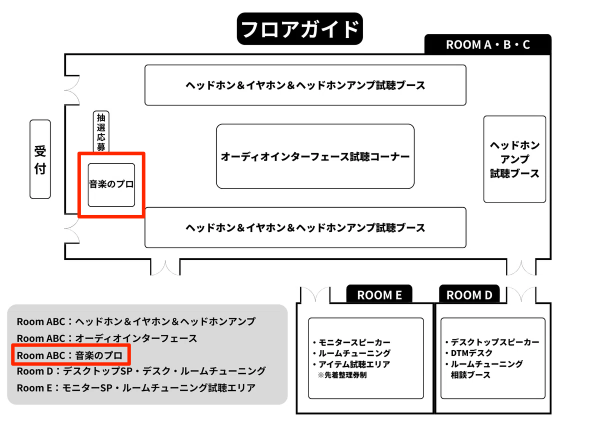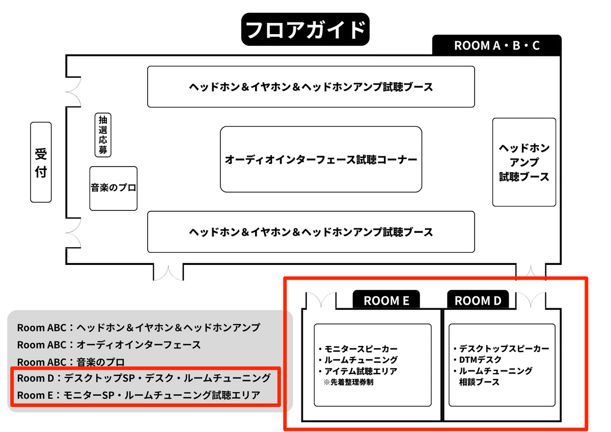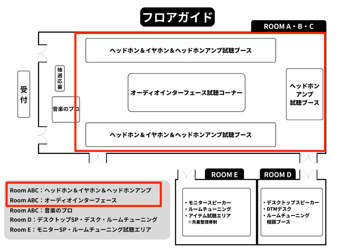 会場のメインスペース「ROOM A・B・C」では、高音質な機材の比較体験が可能となっています。フロアガイドを見てみると、ヘッドホン・イヤホンブースやオーディオインターフェース、ヘッドホンアンプのコーナーが配置されており、これらは自由に回って試聴することができます。今年も人気メーカーが多数出展し、制作環境の要となるモニター機材がずらりと並ぶ予定。