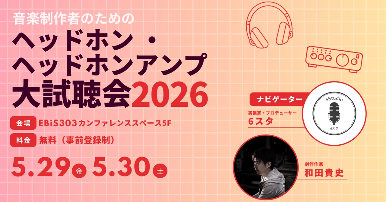 音楽制作者のためのモニター機材体験イベント、ヘッドホン・ヘッドホンアンプ大試聴会が今年も開催されることが決定しました。昨年の第1回目は8月の開催でしたが、今年は気候も穏やかで過ごしやすい5月29日(金)と30日(土)の2日間にわたり、東京の恵比寿にて劇伴作家の和田貴史(@beagle_wada)さんと実業家・プロデューサーの6スタ(@6studio_dtm)さんがナビゲーターを務める「ヘッドホン・ヘッドホンアンプ大試聴会2026」が開催されます。