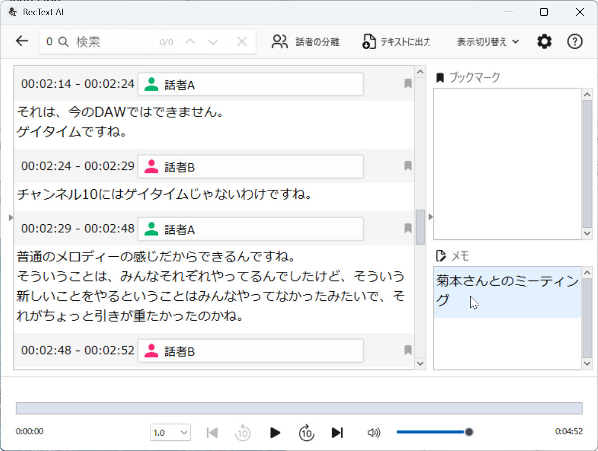 前作のレビューでは、AutoMemoと比較したときのRecText AIの弱点として話者分離がない点を挙げていました。インタビュー記事を多く手がける私自身としても、この機能がないためにAutoMemoからRecText AIへの乗り換えを見送っていました。でも今回の搭載で、その大きなハードルが一つ取り除かれた形です。