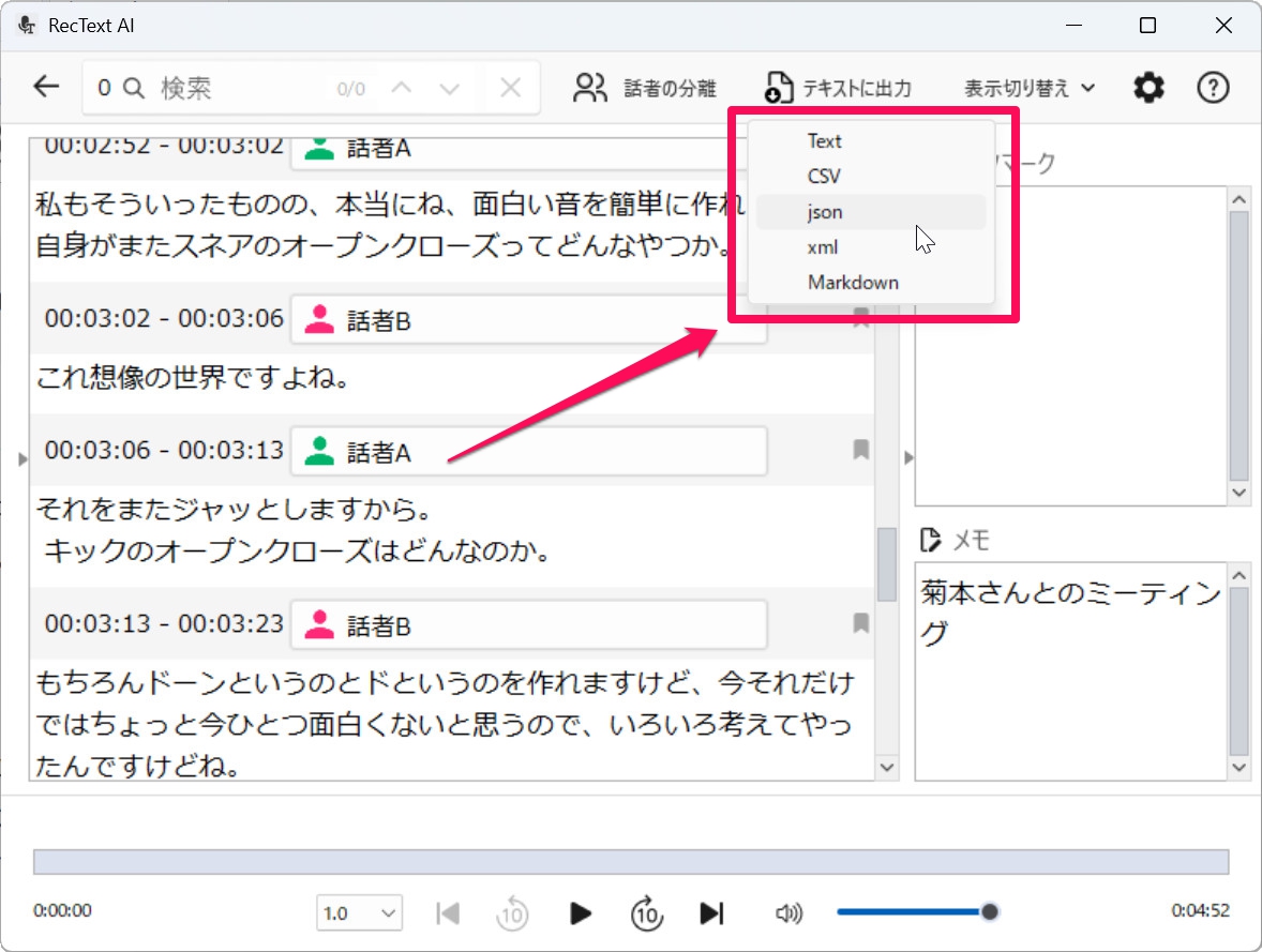 これまで文字起こし結果の出力形式はテキストファイルが中心でしたが、RecText AI 2ではCSV、JSON、XML、Markdownが新たに追加されました。さまざまなアプリや業務フローへの連携がしやすくなっており、用途に応じて使い分けられます。