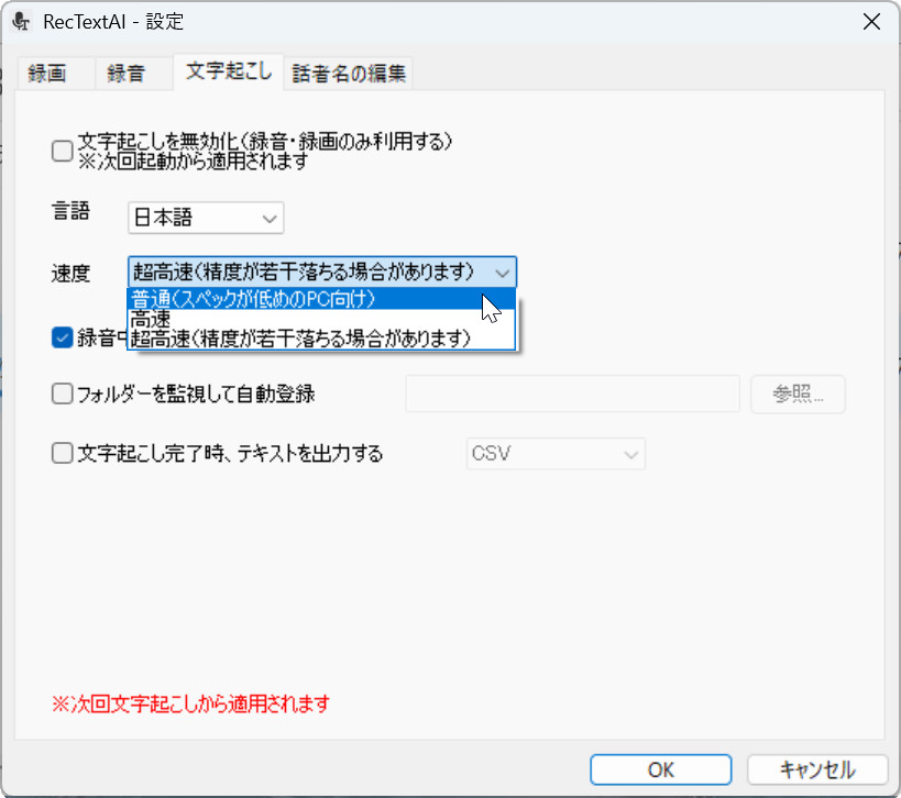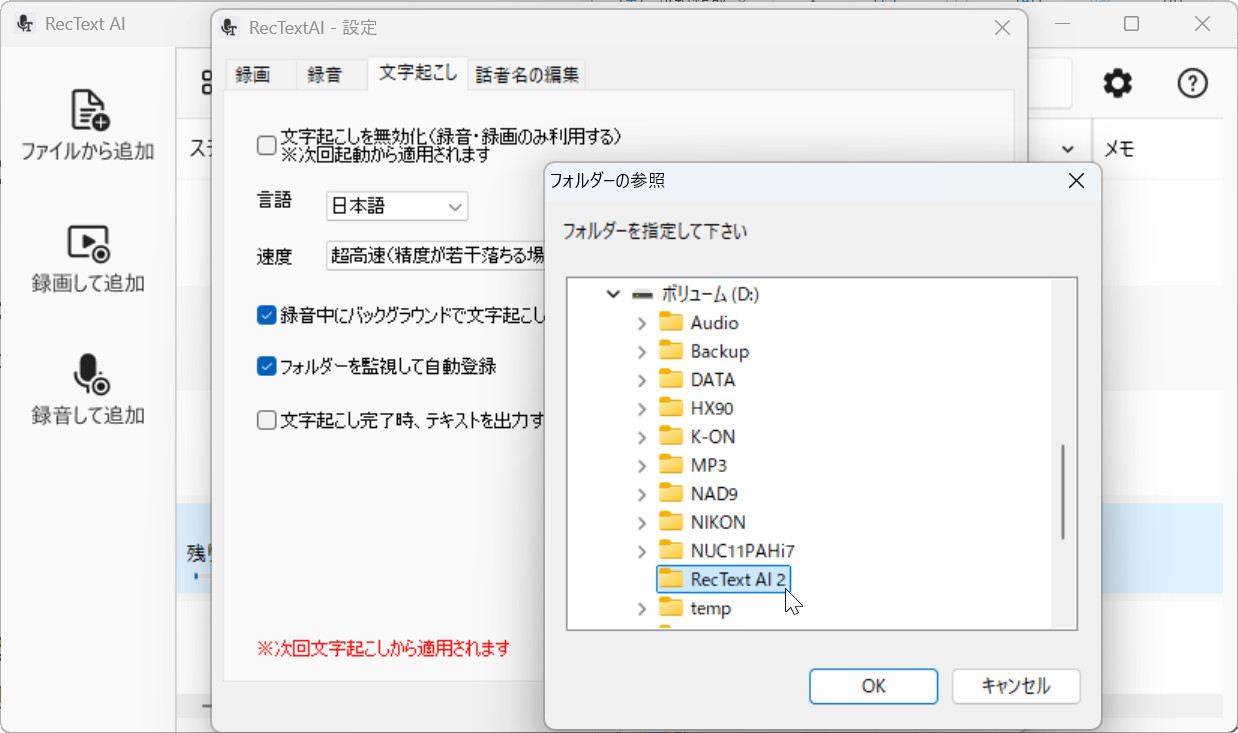 フォルダを指定して監視させることで、そこに入れたファイルを自動で文字起こしできる