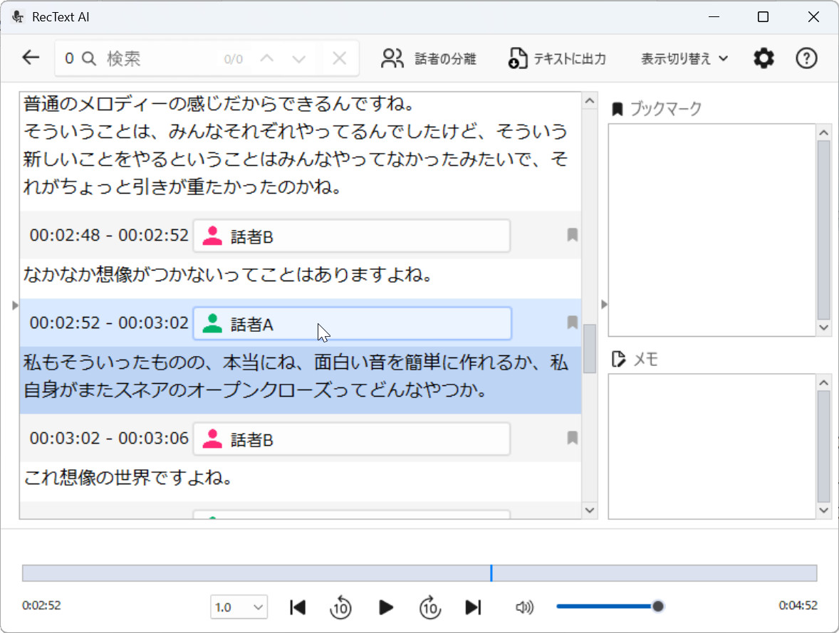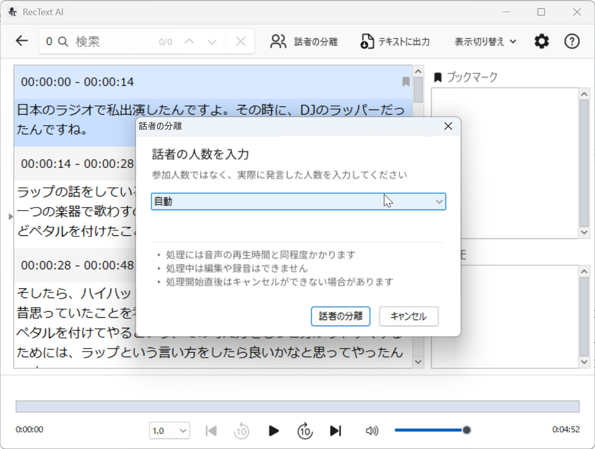 ちなみにAutoMemoの場合は、すべて自動的に話者分離が行われますが、RecText AI 2の場合は、まず文字起こしを行い、その後に「話者の分離」というボタンを押すと話者分離が行われる形です。また、この際、自動で何人いるかが判定はされるのですが、何人の話者がいるかを指定することで、より正確な話者分離を実現できるようになっています。